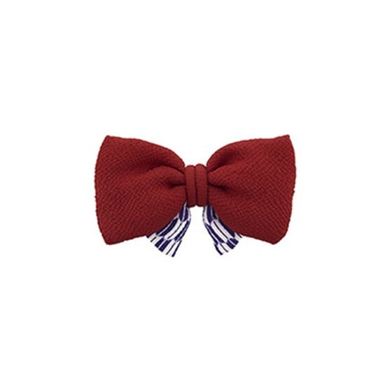 中綿の入った矢羽根の柄と無地の縮緬の生地で、ふっくらとしたリボンの中央は、丸ぐけの紐でまとめられています。
