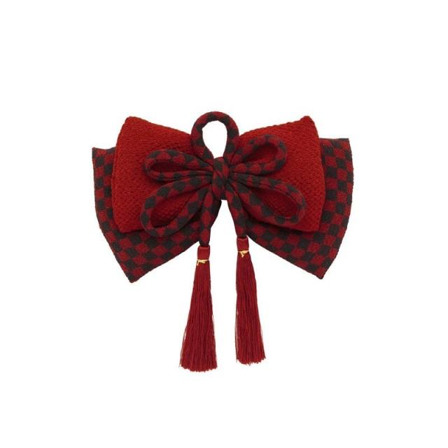 中綿の入った市松格子の縮緬(ちりめん)の生地や無地の縮緬の生地の中央を、房付きの丸ぐけ紐が施された、ふっくらとしたリボンが仕立てられています。