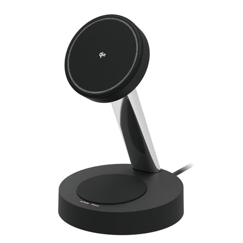●マグネットで固定するだけでQi2対応スマートフォンと対応するAirPodsを同時に充電できる、2in1 Qi2規格ワイヤレス充電スタンドです。最大出力15WでiPhoneを充電できます。