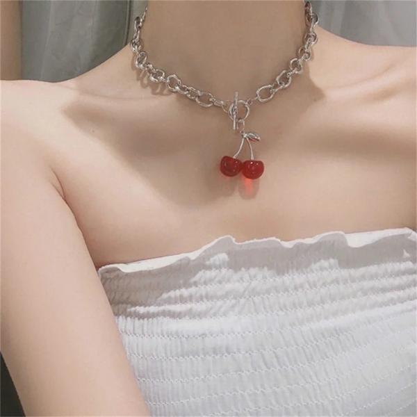 女性用チェリーペンダント付きネックレス,赤,黒,かわいい,10代の女の子用,短いフルーツ,銀メッキの鎖骨チェーン,y2kネックジュエリー