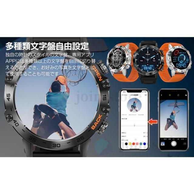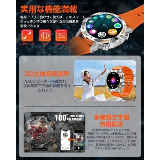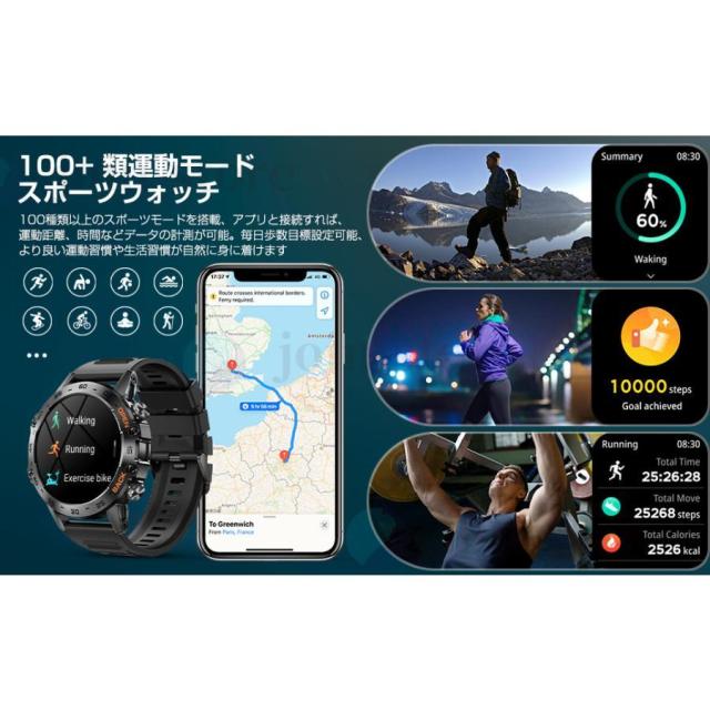 その他 機能 ?歩数計, GPS, カメラ, 天気予報, 100+種類運動モード, 多種類文字盤,着信通知/拒否/通話、輝度調整、活動量計、歩数計、睡眠管理、長座注意、SOS緊急通話、スマートウォッチ探し、バイブレーション強度調整、目覚まし時計、カメラ制御、音楽制御/再生など