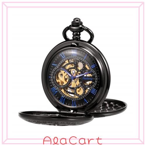 TREEWETO 懐中時計 スケルトン 手巻き機械 ダブルケース ローマ数字 アンティーク フォブチェーンボックス付き ブラック