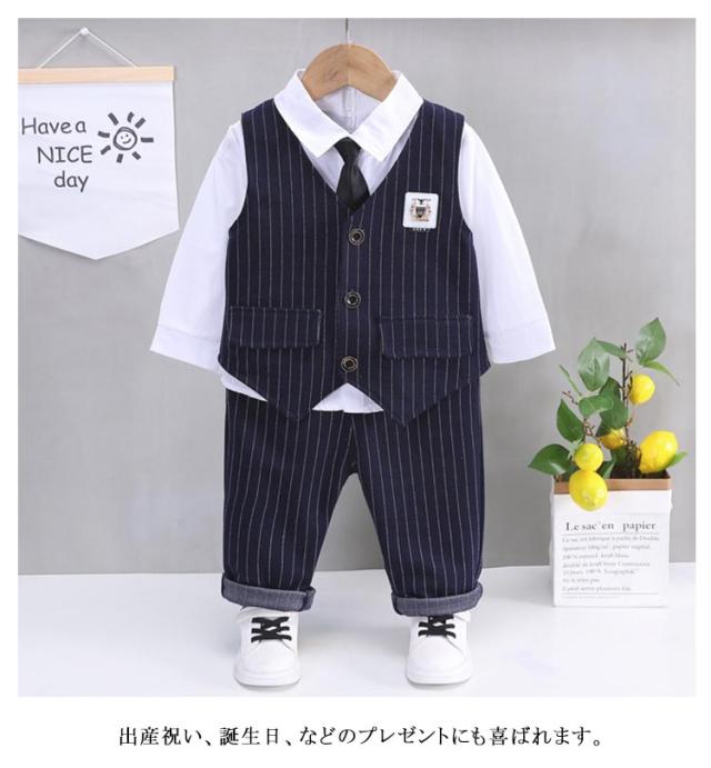 ベビースーツ 七五三 ストライプ柄 ベスト 春 3点セット ロングパンツ 冬 男の子 入園式 男の子 フォーマル セットアップ フォーマル 長袖シャツ 秋 上下セット 洋服 赤ちゃん キッズ 可愛い 結婚式 入学式 卒園式