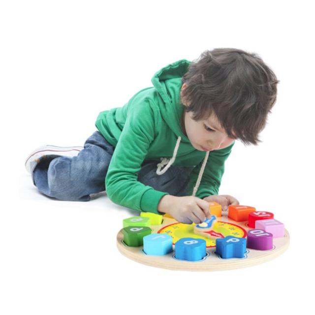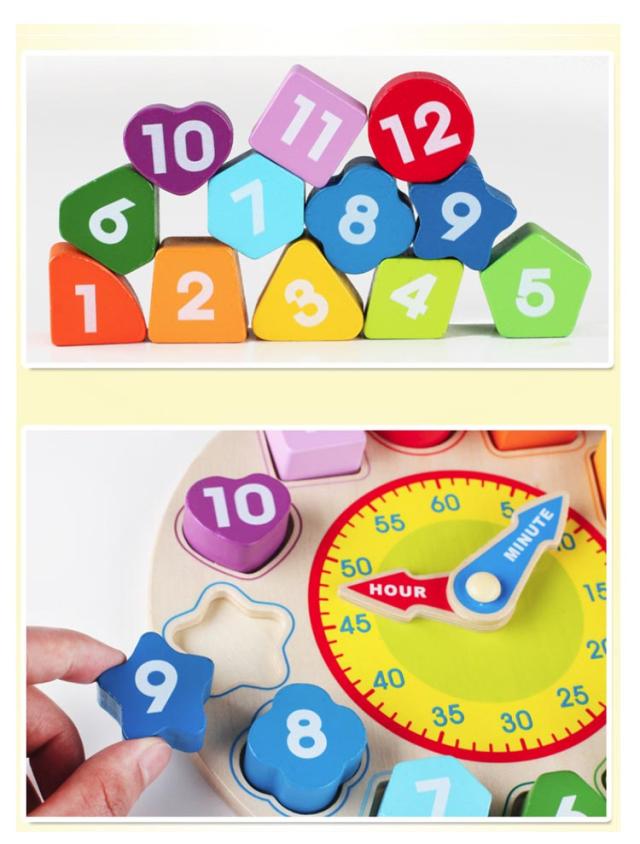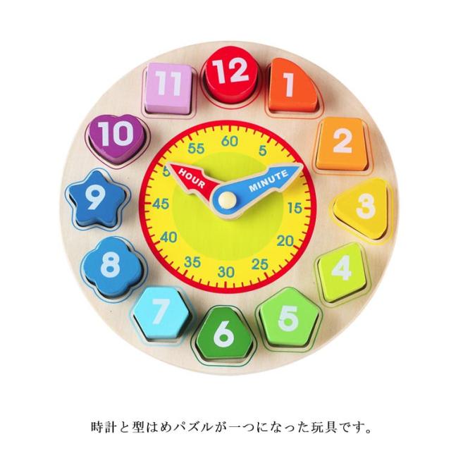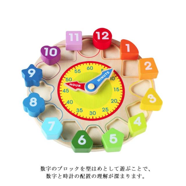| 時計おもちゃ 時計と型はめパズルが一つになった玩具です。 数字のブロックを型はめとして遊ぷことで、数字と時計の配置の理解が深まります。 | |