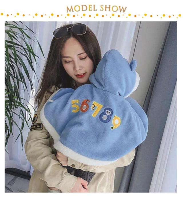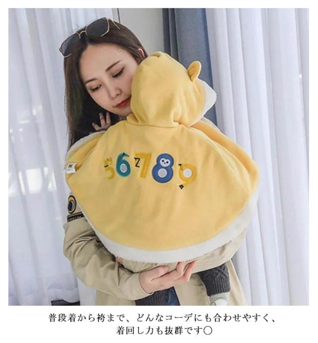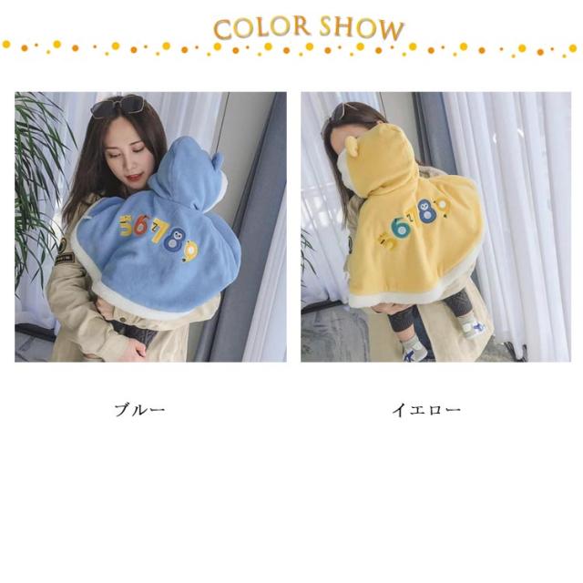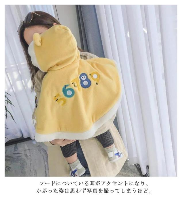 | 寒い冬のお出かけにサッと羽織れて暖かいベビーポンチョが登場! 表面はふわふわ・もこもこの暖かなボア&フリース素材を使用。 フードについている耳がアクセントになり、かぶった姿は思わず写真を撮ってしまうほど。 普段着から袴まで、どんなコーデにも合わせやすく、着回し力も抜群です◯ ベビーマントは、ねんねの時期には膝掛け、おくるみとして使え、首がすわったら、ケープとして手軽に着用できます。 出産のギフトなどにもおすすめのひと品です。 | |