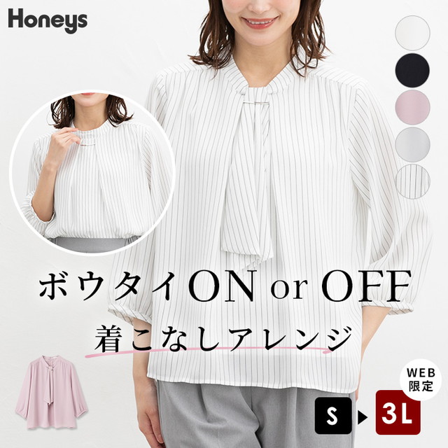 トップス ブラウス 大きいサイズ オフィス きれいめ ボウタイブラウス ボウタイ アクセ付ブラウス レディース Honeys ハニーズ アクセ付7分袖ボウタイブラウス