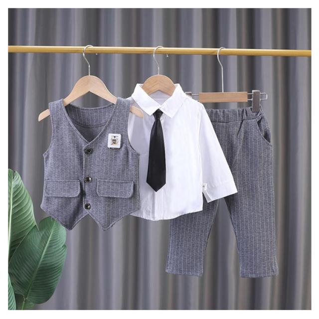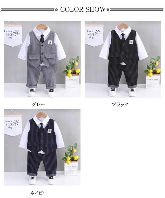| 男の子用フォーマル3点セット。 結婚式や入園式、入学式、パーティーなど何かとイベントが多い時期におしゃれにかわいく主役をキープ。 お食い初めなどの記念撮影にもインスタ映えもバッチリ。 出産祝い、誕生日、などのプレゼントにも喜ばれます。 | |