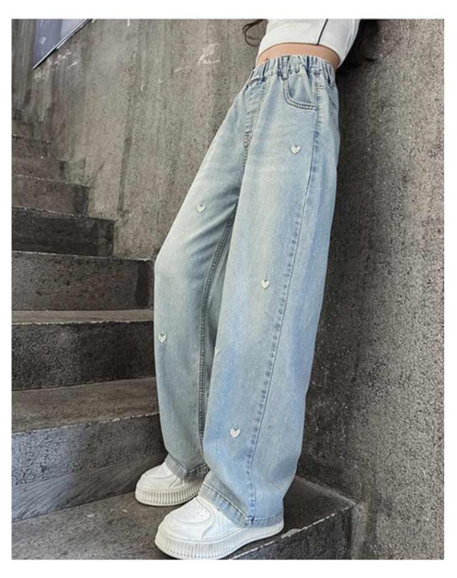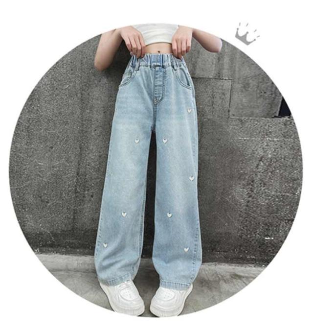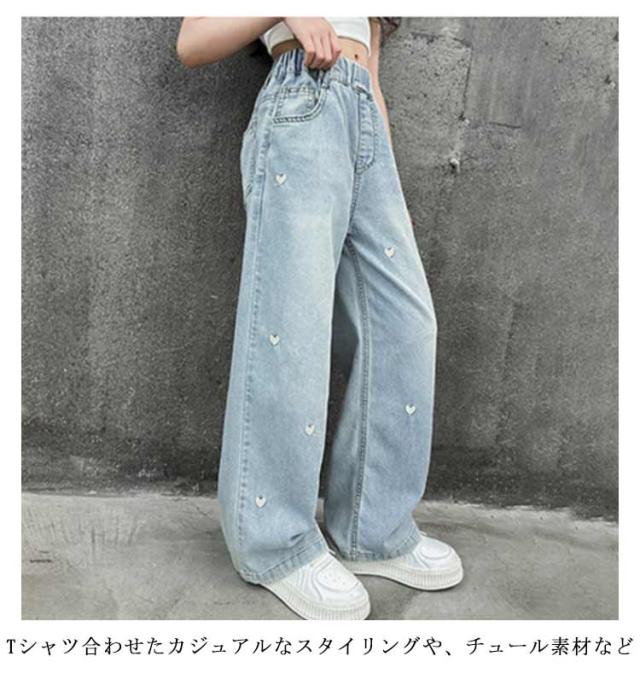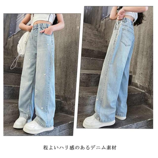 ワイド ワイドパンツ ハート刺繍 デニム 春 秋 長ズボン ロング ワイド パンツ ロング丈 子供服 キッズ デニムパンツ ハート刺繍 ロングパンツ 女の子 ボトムス デニムワイドパンツ ワイドデニムパンツ 夏 キッズ用 120 130 140 150 160 170 cm