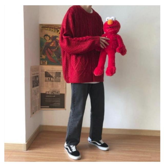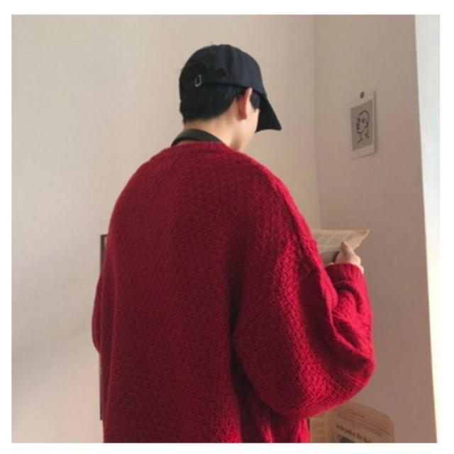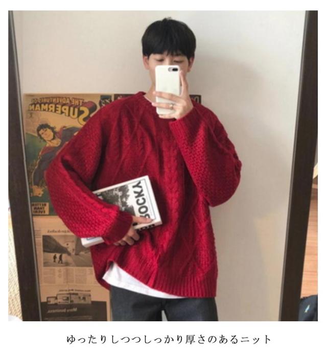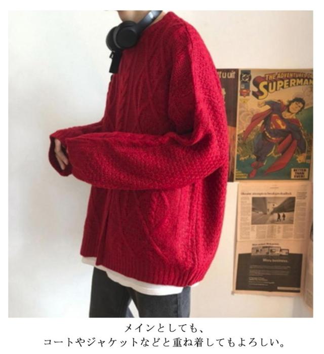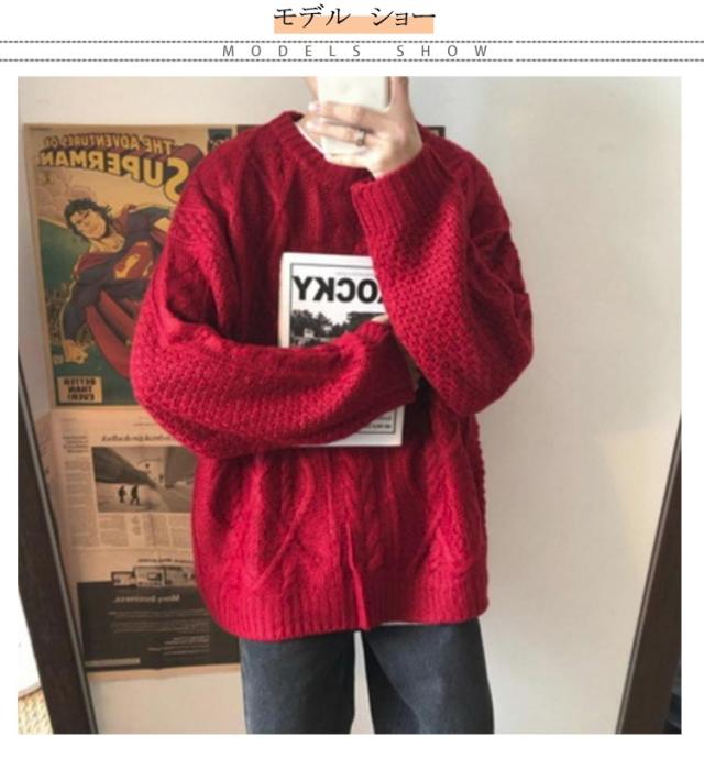 ニット ゆったり プルオーバー セーター レッド ビッグニット 重ね着 ニット メンズ クルーネック 赤 ニット ニットセーター セーター オーバーサイズ 体型カバー ビッグシルエット 韓国ファッション 冬服 冬 春 秋冬 メンズファッション