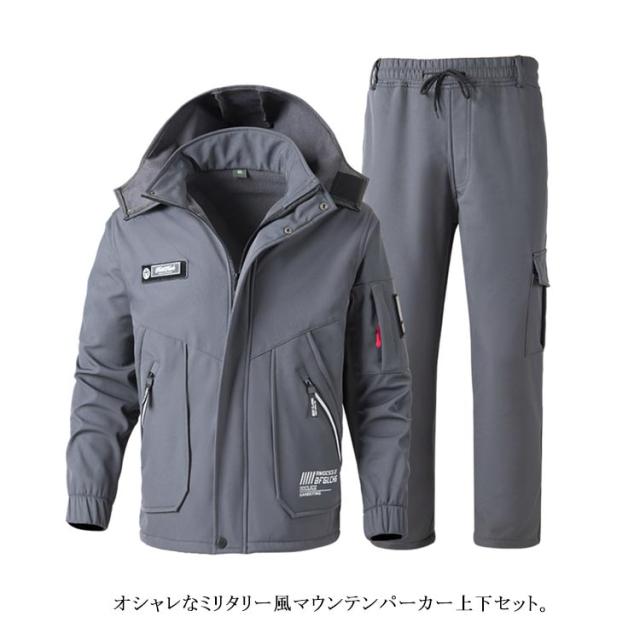 | 裏起毛で!過酷な冬の味方! オシャレなミリタリー風マウンテンパーカー上下セット。 裏面優しい肌触りが特徴のボアフリースが使われているので風邪を通さず、保温性も兼ね揃えたアイテムに仕上げられております。 撥水加工で水を弾き、防風機能を備え生地からの冷たい風の侵入も防ぎます。 実用性の高いポケットがたくさん完備、手ぶらでお散歩なども◎ これからの季節の通学・通勤に最適な防水・防寒スーツセット、 トレッキング、釣り、登山、山ガール、ウォーキング、バイクツーリング、キャンプ、サイクリング、ゴルフなど、様々なアウトドアシーンも着用できます。 | |