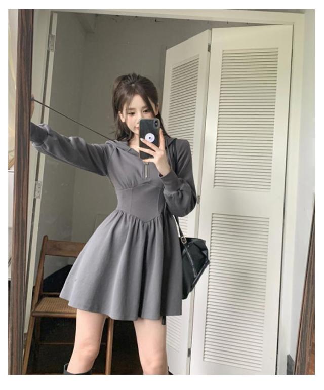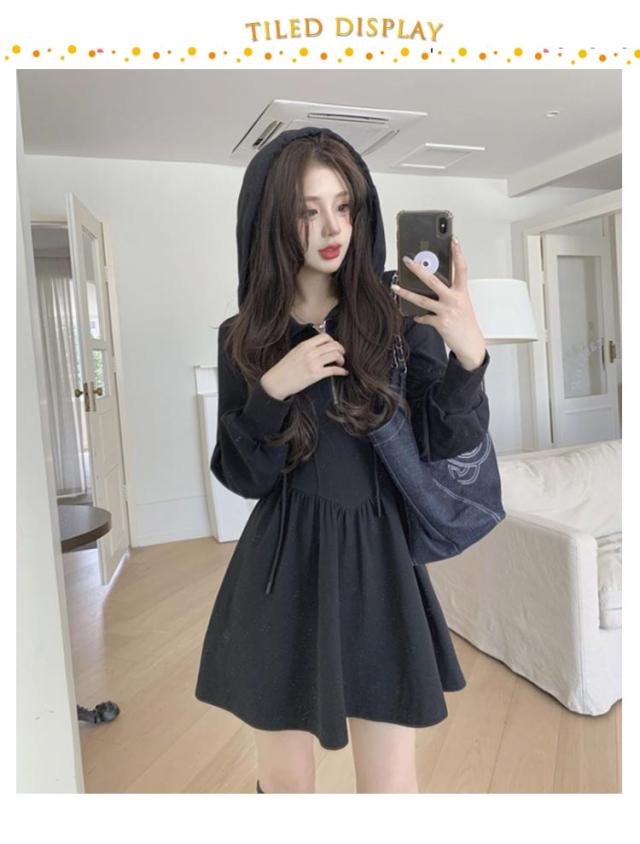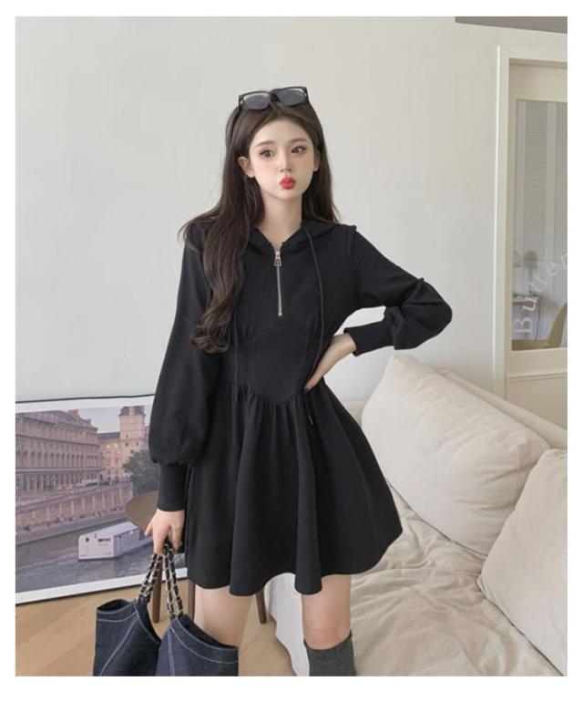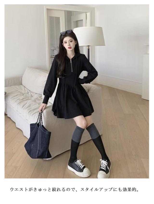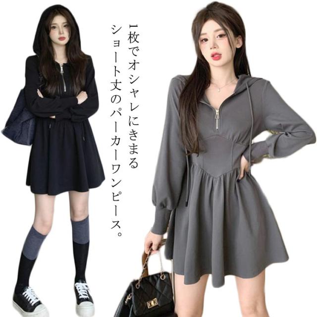 パーカーワンピース レディース パーカーワンピース フード付き 楽ちん スウェット ハーフジップ トレーナー ミニワンピース ウエストシェイプ タック Aライン パーカー ショート丈 スウェットワンピース ブラック