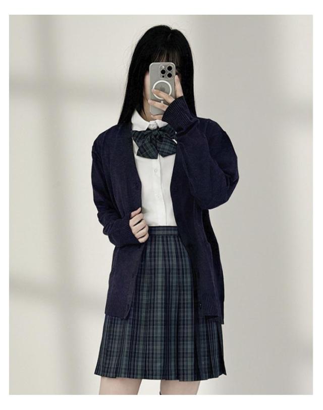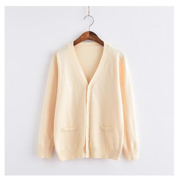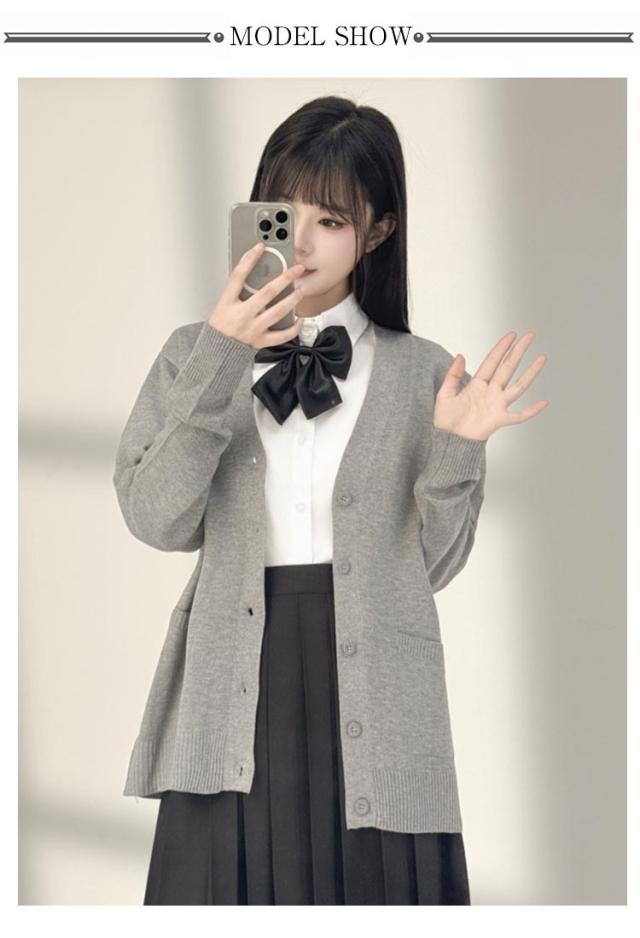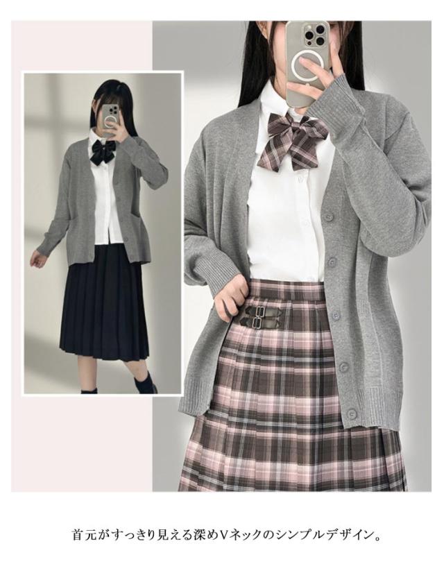 | スクールコーデには欠かせないカーディガン。 首元がすっきり見える深めVネックのシンプルデザイン。 ほどよいゆるっと感がありYシャツの上から羽織るだけでかわいい! | |