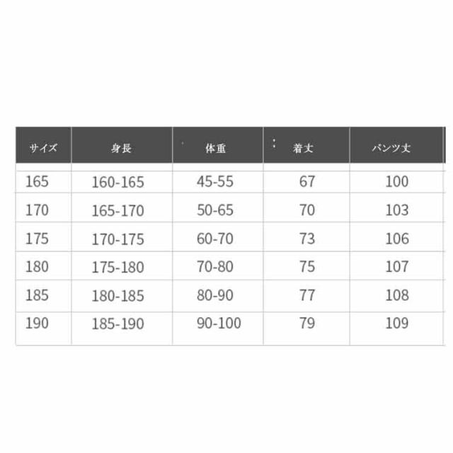 | サイズについての説明 | 165お勧め身長160-165cm お勧め体重45-55kg 170お勧め身長165-170cm お勧め体重55-65kg 175お勧め身長170-175cm お勧め体重60-70kg 180お勧め身長175-180cm お勧め体重70-80kg 185お勧め身長180-185cm お勧め体重80-90kg 190お勧め身長185-190cm お勧め体重90-100kg ※サイズ表の実寸法は商品によって1-3cm程度の誤差がある場合がございます。 |