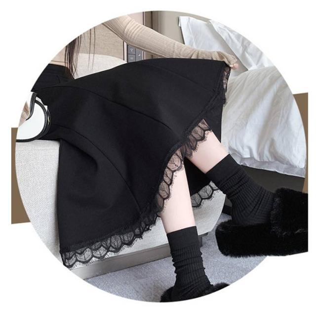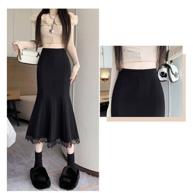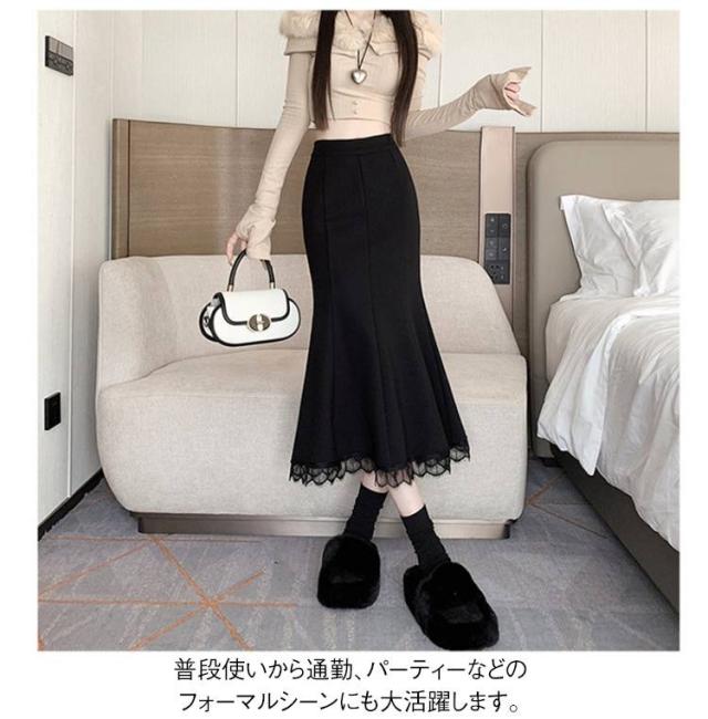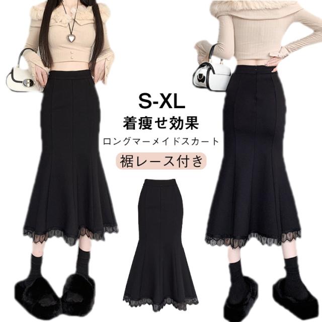 ロングスカート マーメイドスカート ロング スカート ミモレ丈スカート マキシスカート タイト ハイウエスト 無地 裾レース 着痩せ 秋冬 春 秋 送料無料