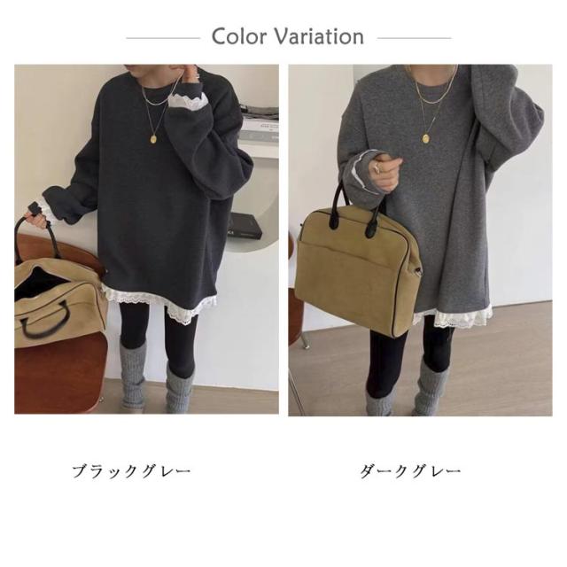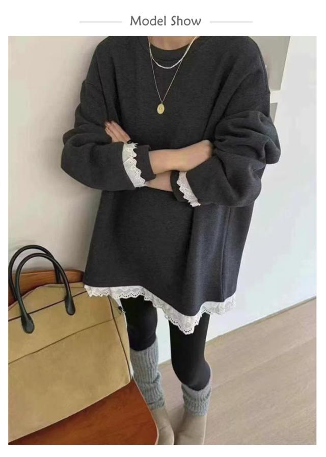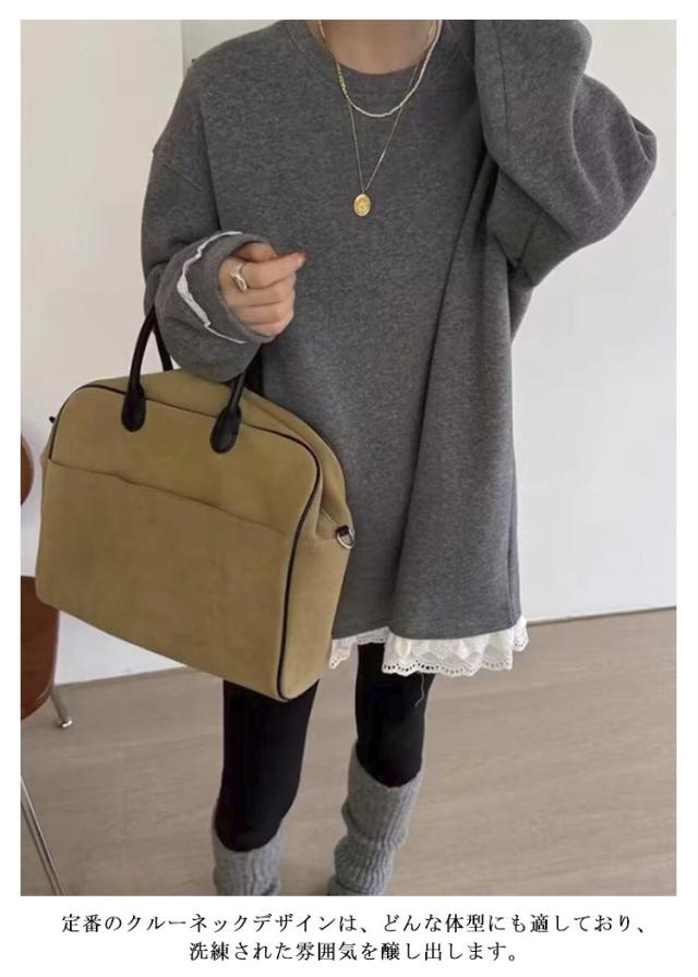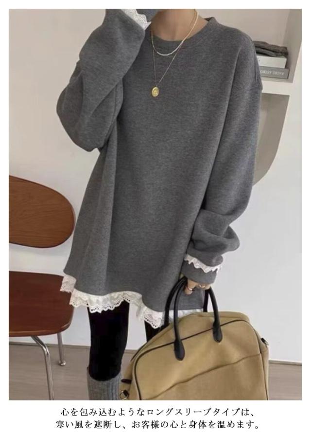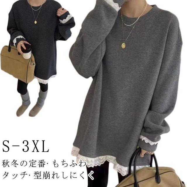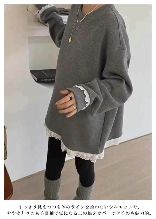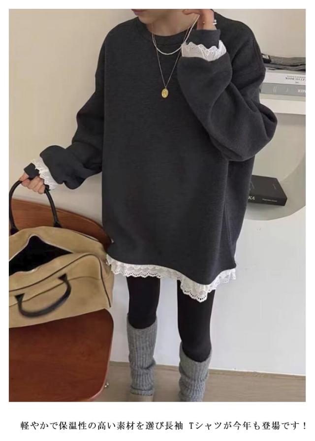 Tシャツ トップス レディース やわらかい S-3XL 裾レース 長袖 起毛素材 ふわふわ 重ね着 レイヤード スウェット S-3XL カットソー ティーシャツ 丸首 クルーネック カジュアル オーバーサイズ 着痩せ ゆったり 無地 シンプル きれいめ