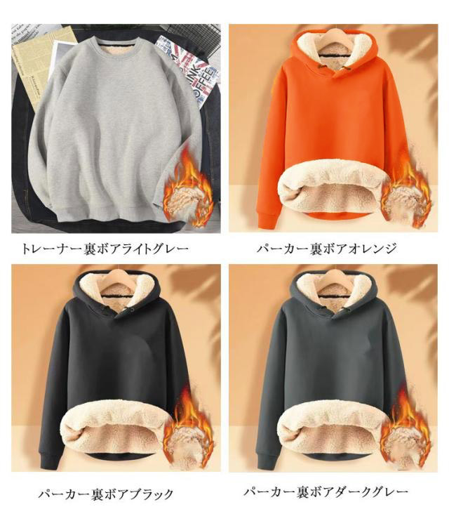 | 色 | トレーナー裏ボアオレンジ トレーナー裏ボアブラック トレーナー裏ボアダークブルー トレーナー裏ボアダークグレー トレーナー裏ボアライトグレー パーカー裏ボアオレンジ パーカー裏ボアブラック パーカー裏ボアイエロー パーカー裏ボアダークグレー パーカー裏ボアライトグレー |