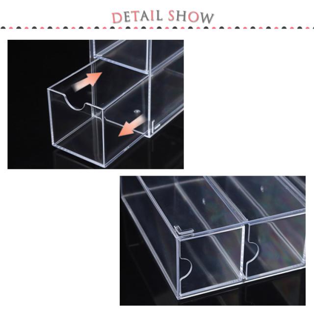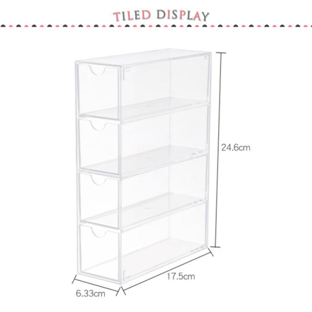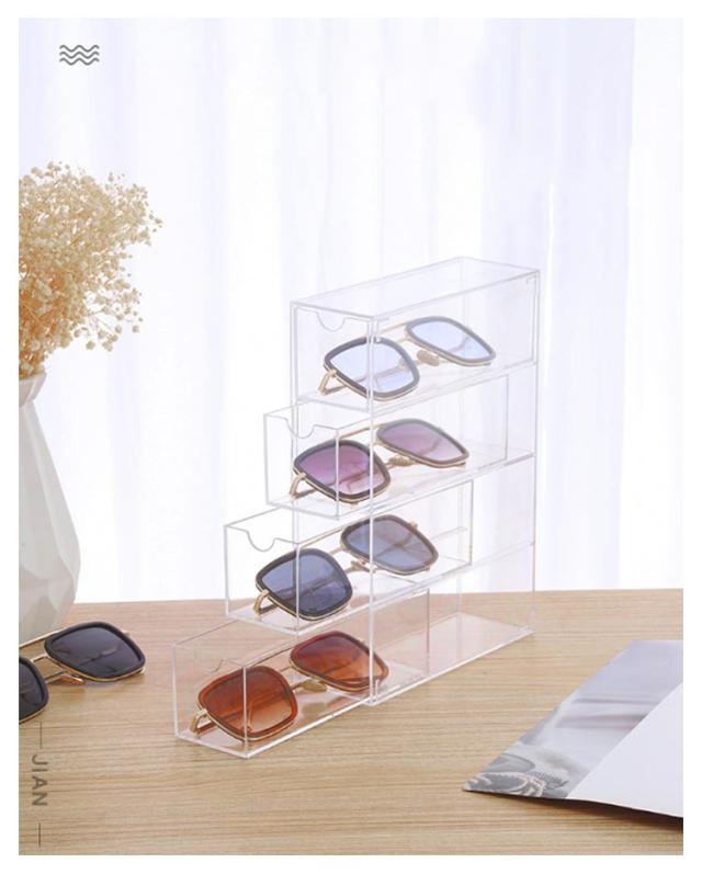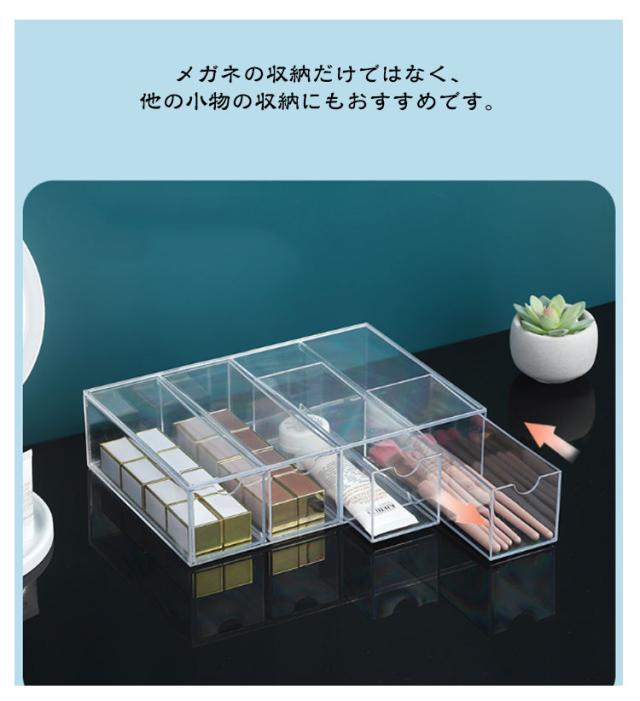 | 【メガネケース】【8本収納】 引き出し式のデザインで、出し入れしやすい。 透明なケースは、外から中が見えるため、メガネ以外にも腕時計やアクセサリーの収納・ディスプレイ用としてもぜひご活用下さい。 メガネの収納だけではなく、他の小物の収納にもおすすめです。 コンパクトでテーブルの上に置いてあっても邪魔になりません。 | |
