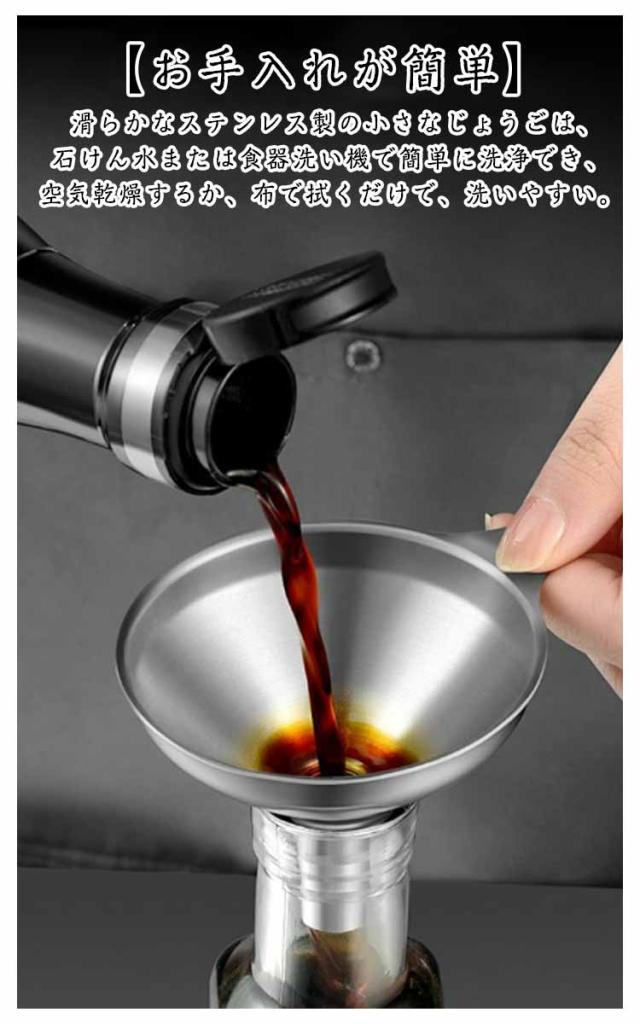 | 漏斗大中小3点セット ステンレス製、防錆性と耐久性と耐熱性がある。 【多機能】さまざまなコンテナのニーズを満たすために、3つの異なるサイズの注ぎ口とネストがあり、液体を迅速かつ正確に供給します、作業効率を上げる。 【お手入れが簡単】 滑らかなステンレス製の小さなじょうごは、石けん水または食器洗い機で簡単に洗浄でき、空気乾燥するか、布で拭くだけで、洗いやすい。 【幅広い用途】醤油、ワイン、酒、香水、エッセンシャルオイル、スパイスなどに使用できる。さまざまな容器やボトルから液体や粉末を注いで移すのに最適です。 | |