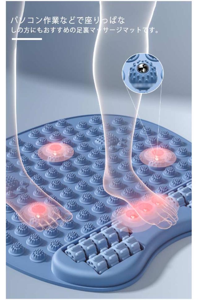 | 健康は足の裏から!日々の疲れを癒す足ツボマットです。 踏むだけで足の裏の反射区を刺激することで、新陳代謝と血液循環を促進します。 柔らかいTPE製のマットなので、ツボ押し部分が変形してしまう心配もございません。 玄関などに置いておくだけで、立ちっぱなしで仕事をした日や1日中歩き回った日に、家に帰ってから気軽に足裏マッサージます。 パソコンデスクやテーブルの下に、この足ツボ押しマッサージマットを置いて、座りながら気軽に足ツボマッサージをすることもできます。 パソコン作業などで座りっぱなしの方にもおすすめの足裏マッサージマットです。 汚れが付着しにくいマットで、もし汚れが付いてしまっても、簡単に水洗いで落とすことができます。 | |