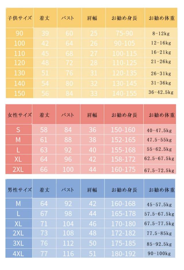 | サイズ | 90cm 100cm 110cm 120cm 130cm 140cm 150cm 女性S 女性M 女性L 女性XL 女性2XL 男性M 男性L 男性XL 男性2XL 男性3XL 男性4XL |