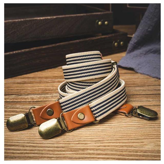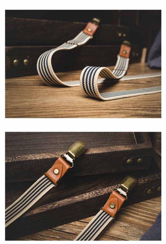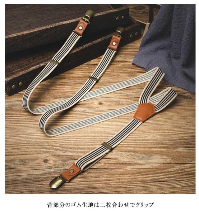 | 上質な革仕様のY型カジュアルサスペンダー アジャスターの調節で長さ調節可能 背部分のゴム生地は二枚合わせでクリップ | |