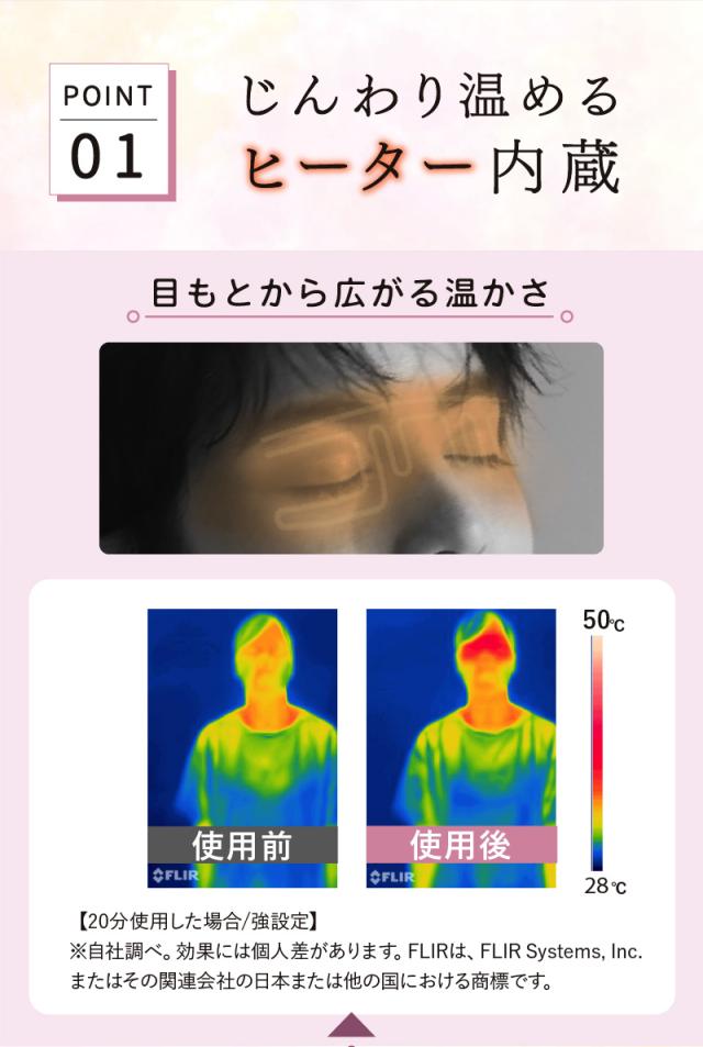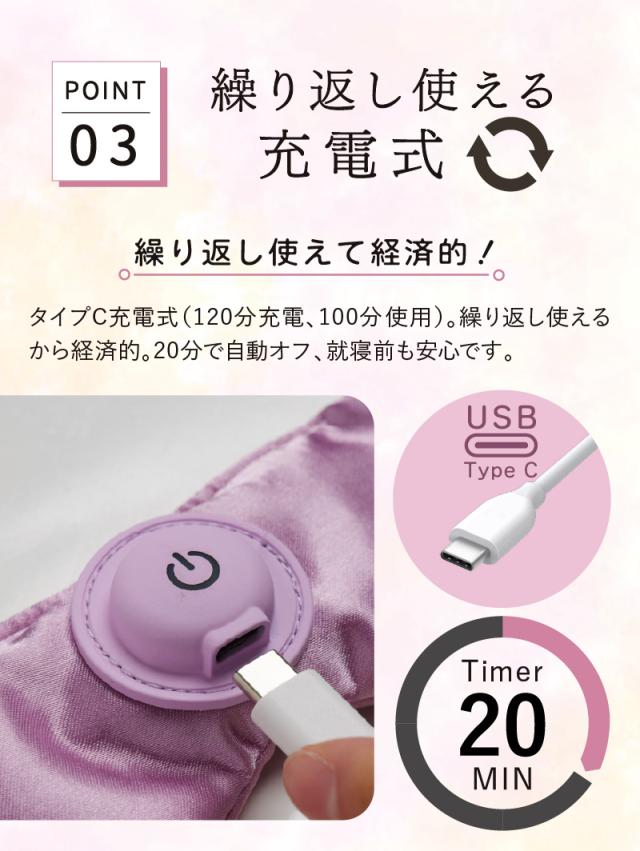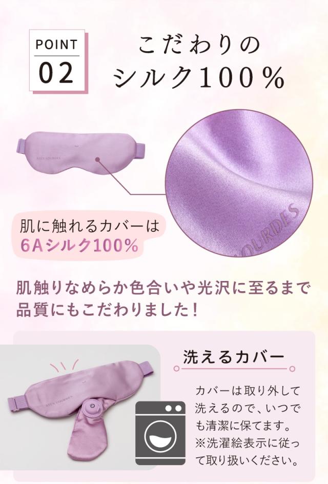 シリーズ累計80万台の「めめホット」から。付け心地の良いシルク100%素材のカバーとコードレスデザイン(バッテリー一体型)で新登場。さらに3段階の温度調節機能や約50gの軽量さ、顔にフィットするための調節ゴムバンド、邪魔にならないボタン位置など、毎日の使いやすさをとことん追求しました。また、シルク素材のカバーは取り外して洗えます。