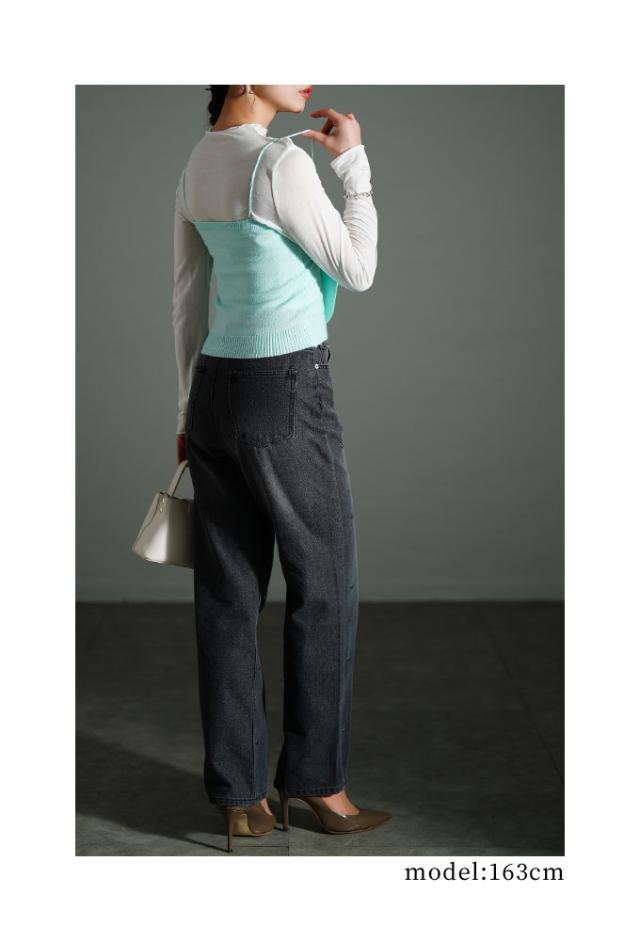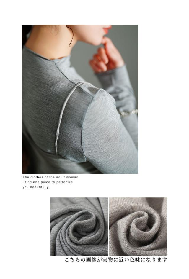 インナーの着丈は骨盤にかかるくらいです。首元はプチハイネックです。袖は親指が隠れるくらいです。伸縮性のある柔らかい生地でフィット感があります。ニットキャミソールの着丈はウエストくらいです。脇グリもちょうどいい開き具合です。身幅もニットなので程よくフィットして、とてもスッキリして見えました。キャミソールの胸元部分でリボンを結ぶデザインで、好みでフィット感を調整出来るのもいいですね。柔らかいニットで肌触り良く着心地も良かったです。