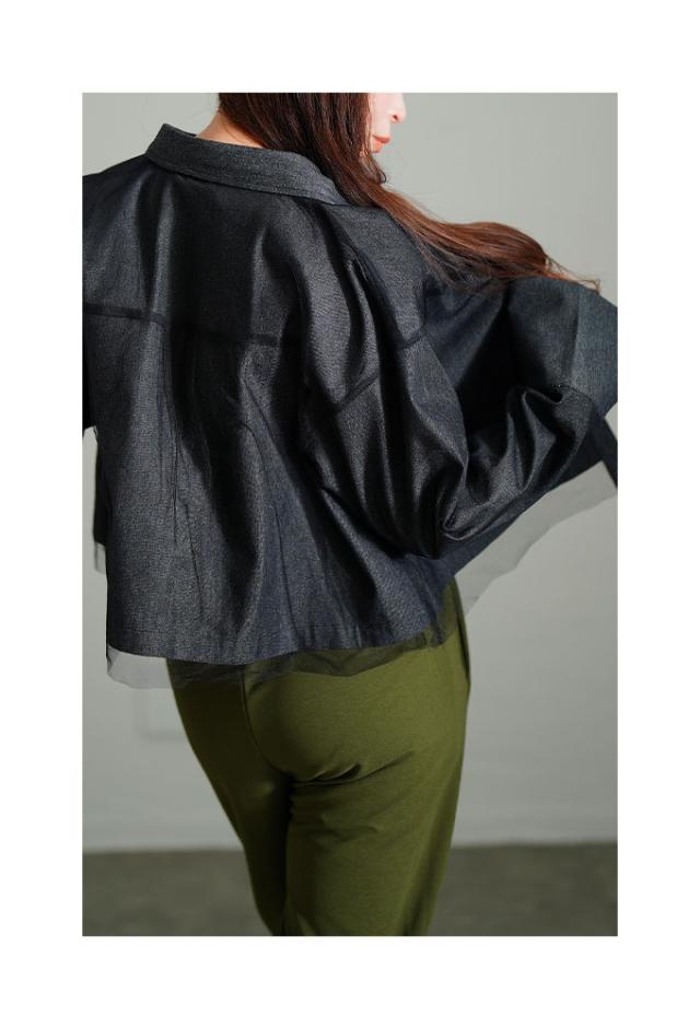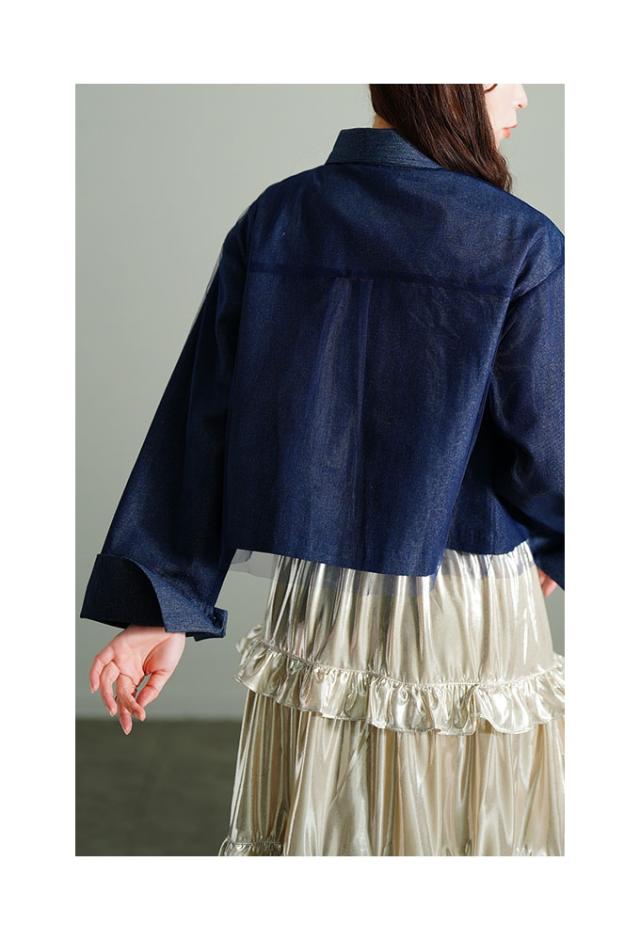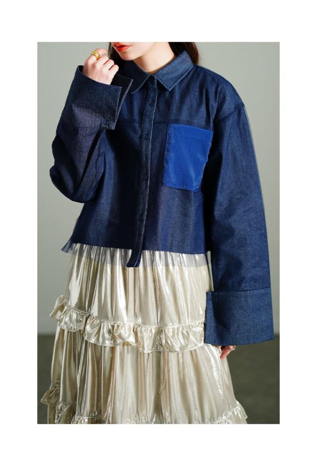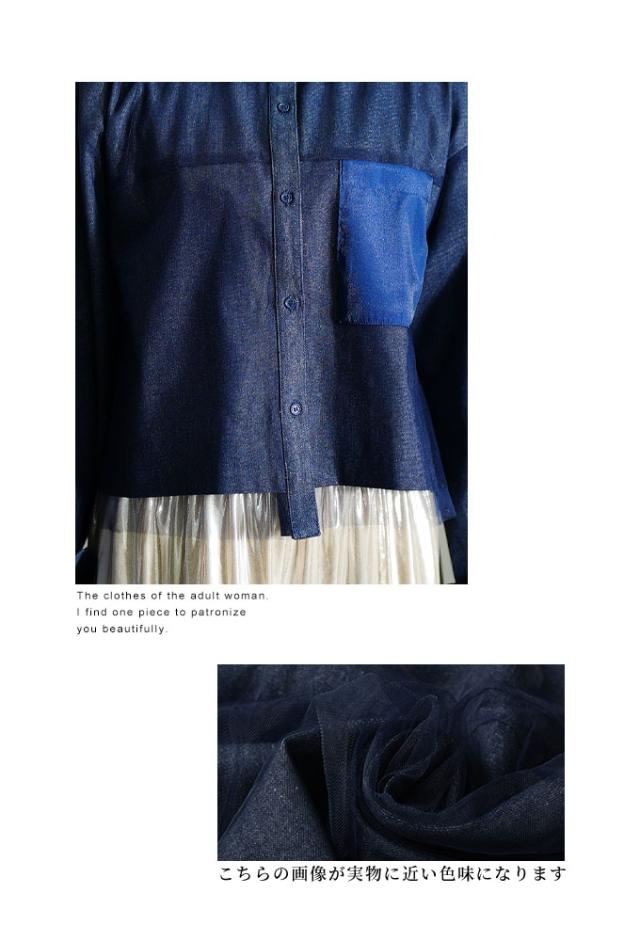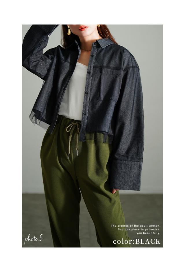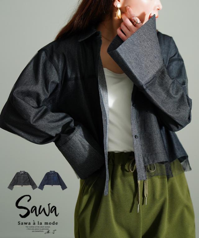 春新作 カジュアルなモード感デニムシャツジャケット レディース ファッション トップス シャツ デニム 異素材 チュール 無地 羽織り ブラック ブルー 黒 青 30代 40代 50代 60代 サワアラモード sawaalamode otona 大人 cawaii 可愛い 洋服 かわいい服 swdt-381f3211