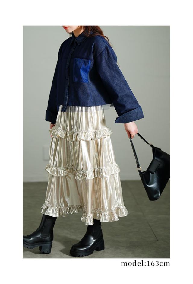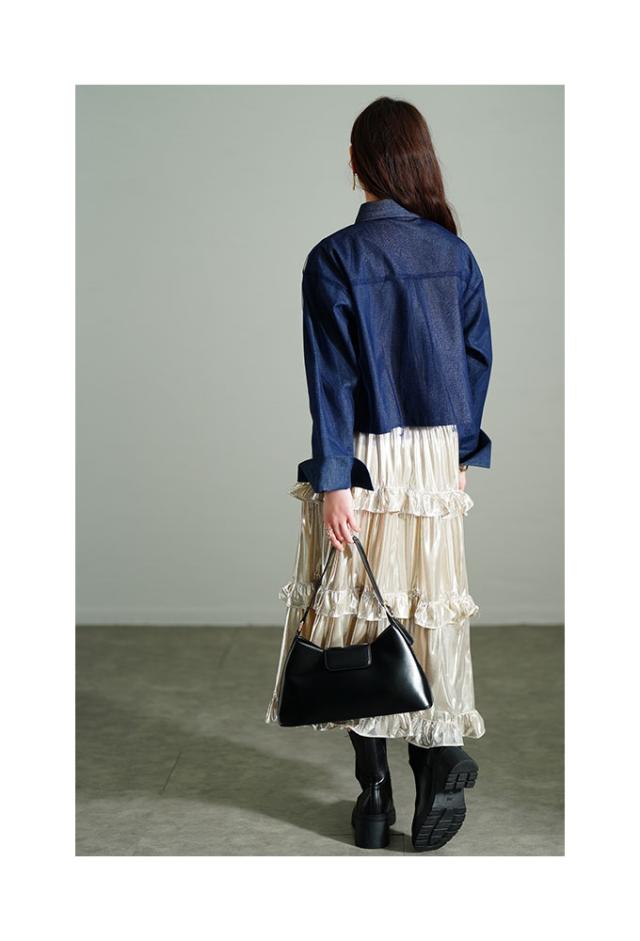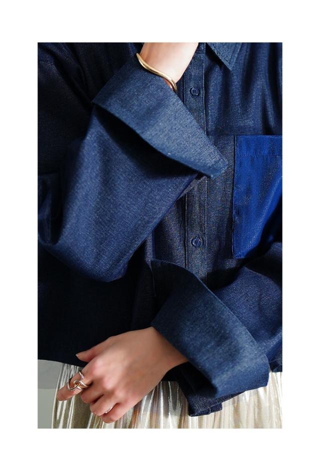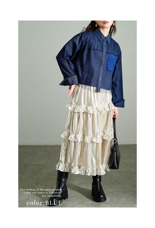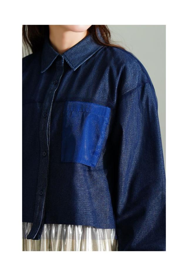 春新作 カジュアルなモード感デニムシャツジャケット レディース ファッション トップス シャツ デニム 異素材 チュール 無地 羽織り ブラック ブルー 黒 青 30代 40代 50代 60代 サワアラモード sawaalamode otona 大人 cawaii 可愛い 洋服 かわいい服 swdt-381f3211