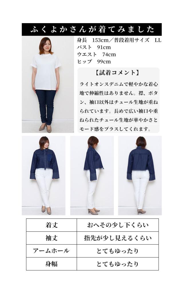 着丈は骨盤が隠れるくらいです。首元はレギュラーカラーで余裕がありました。袖は手がすっぽり隠れます。カフス部分にスリットが入っているので折り返して着用すると手の甲にかかるくらいでした。脇グリ、身幅共にとても余裕があり楽に着用出来ました。袖と身頃に柔らかいチュールがドッキングしたデザインでお洒落です。軽いデニム生地で肌触りもよく、短めの丈なのでボトムも選ばずコーデが楽しめます。