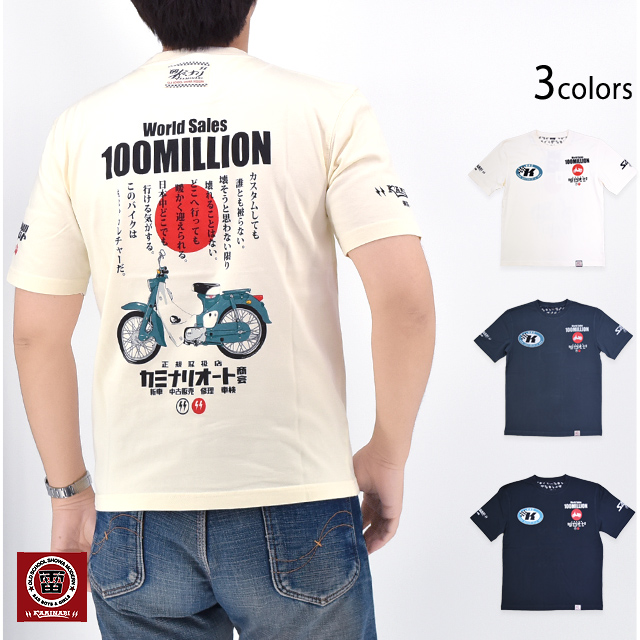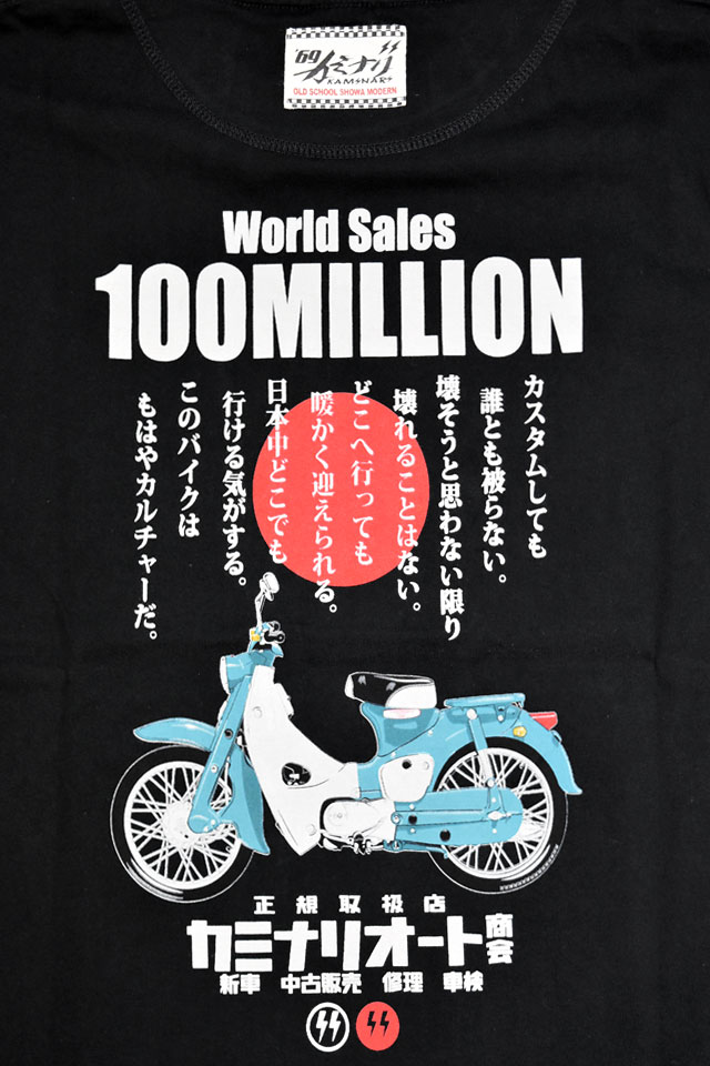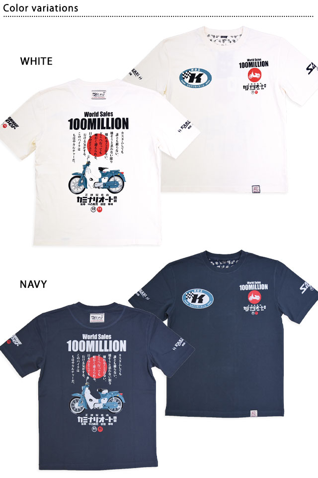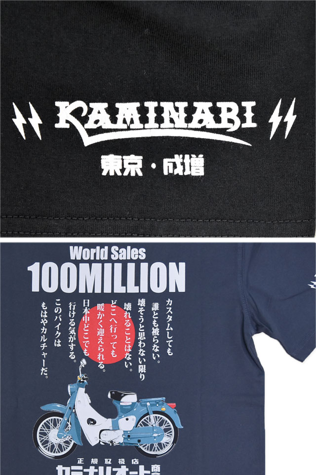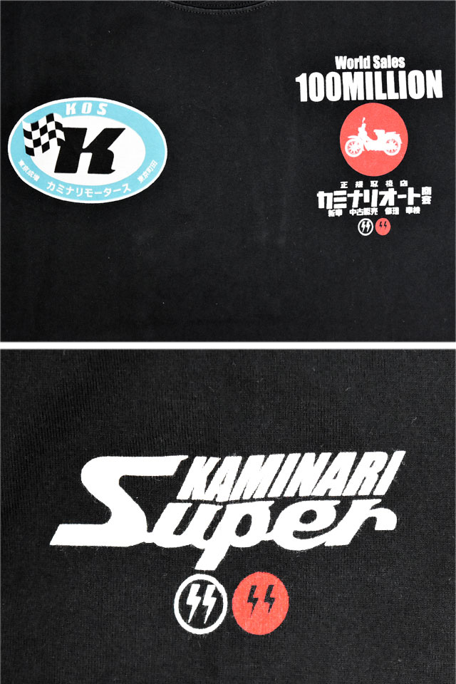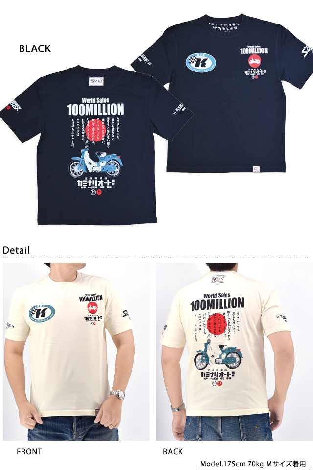 「JAPANESE BAD BOY」をコンセプトに掲げ、昭和の由緒正しき不良文化にロックなスパイスを注入したブランド「カミナリ」より「1億台半袖Tシャツ(KMT-250)」が入荷してまいりました。 昭和レトロなバイクカルチャーを愛する方にぴったりの伝説の名車「スーパーカブ C100」をオマージュした半袖Tシャツです。 背中には、誕生以来世界中で愛され続けているスーパーカブを落とし込みました。 バイク愛をさりげなくアピールできる、こだわりの逸品です。 左袖には「KAMINARI Super」のロゴをプリント。 右袖にはブランドロゴをワンポイントでデザインしました。 生地はストレッチのきいた、さらりとしたものを使用。 | |||||||||||||||||||||||||