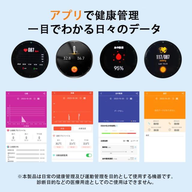 多機能健康管理:無侵襲多機能測定、24時間体温、高精度心拍数、血中酸素などの測定機能を一瞬で確認でき、スマホと同期した後アプリで健康状態データを一目で分かります。