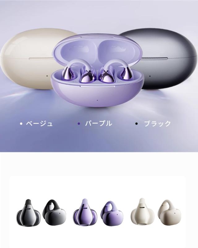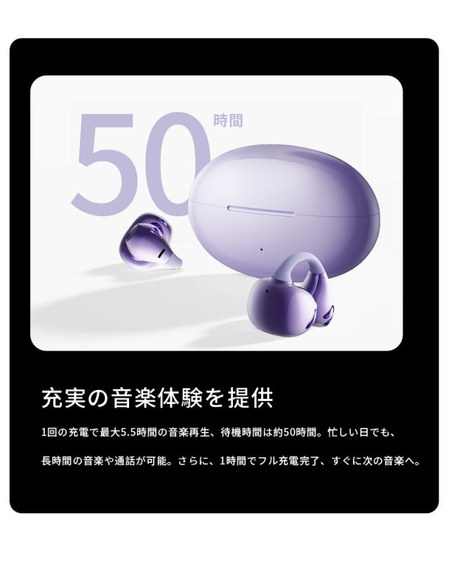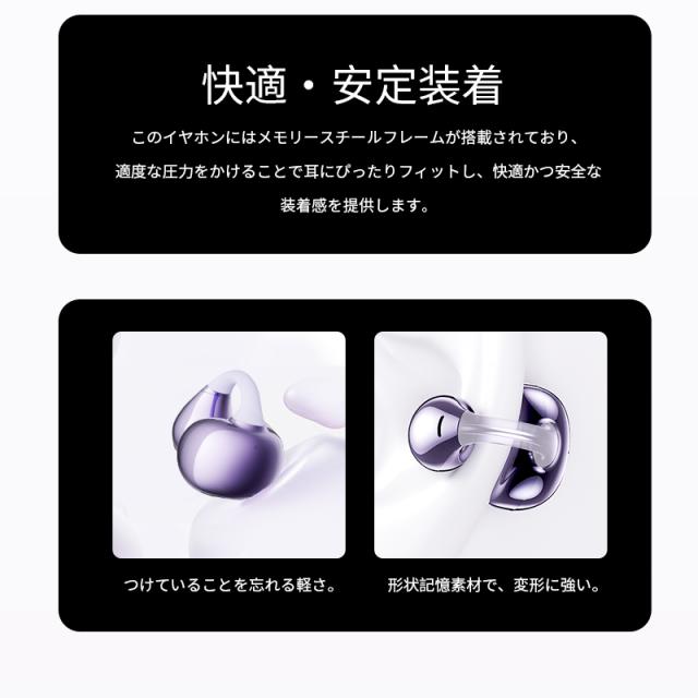 長時間の装着を考慮し、快適性を優先して設計で、イヤーカフのように、耳に挟むだけで耳を塞がなく使用できます。圧迫感がなく、長時間付けても快適です。