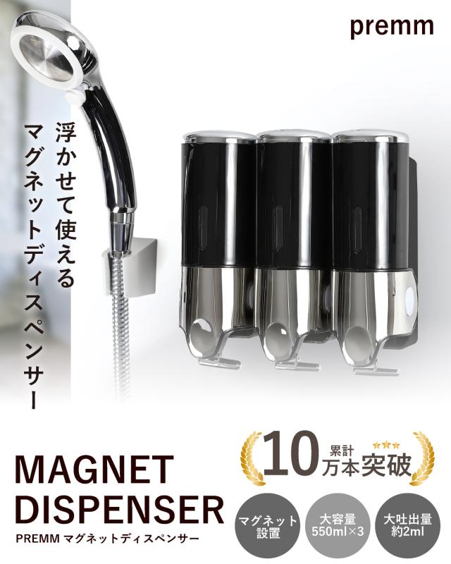 PREMM 公式 ディスペンサー マグネット シャンプーボトル シャンプーディスペンサー 壁掛け式 (大容量 500ml ×3本)【レビュー投稿で1年保証】【累計10万本突破!】