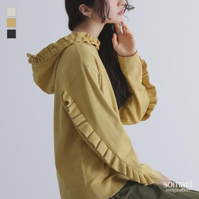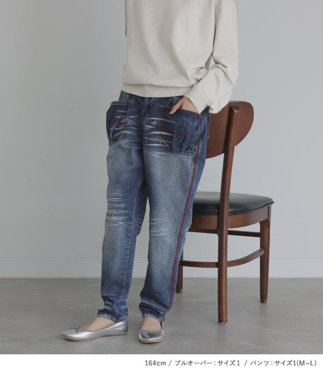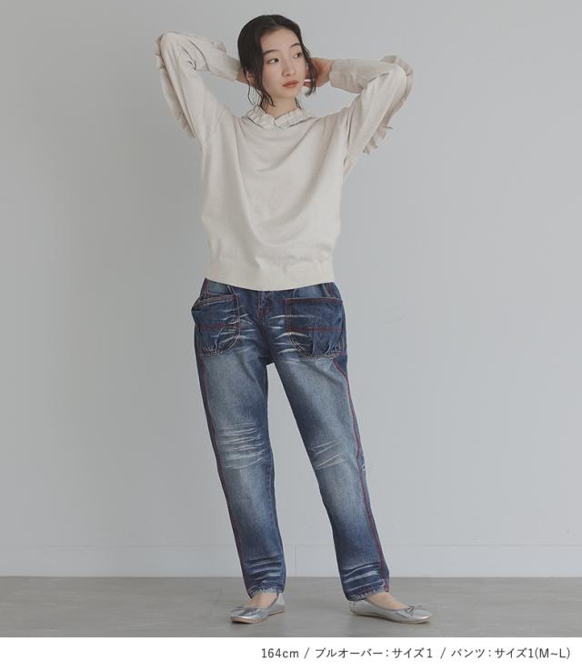 【送料無料】『フリルフードニットプルオーバー×赤ステッチサルエルdesignデニムコーデ2点SET』【メール便不可】【40】[2点コーデセット 2025 レディース ニット トップス セーター ボトムス パンツ デニム]