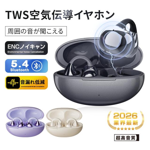 【2026年発売モデル】 空気伝導イヤホン Bluetooth5.4 完全ワイヤレスイヤホン 挟み込み 耳に入れない 耳を塞がない ながら聴き ENC ノイズキャンセリング 高音質 マイク ハンズフリー通話 安定装着 防水防滴 Type‐C充電 コンパクト 軽量 【PL保険加入済み製品・安心】