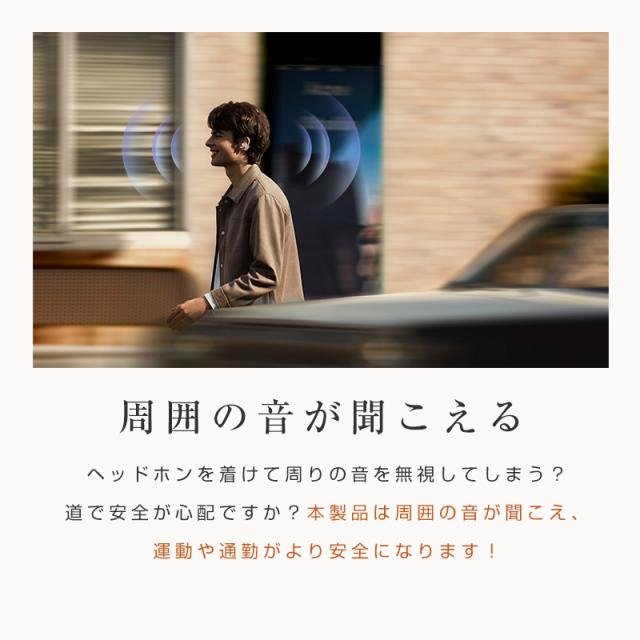 長時間の装着を考慮し、快適性を優先して設計で、イヤーカフのように、耳に挟むだけで耳を塞がなく使用できます。イヤホンを耳穴に挿入しないため、耳を覆うような圧迫感がなく、長時間使用しても耳穴が蒸れにくく快適です。