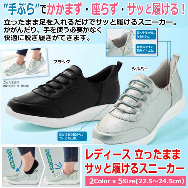 レディース立ったままサッと履けるスニーカー(座らずはける靴 手ぶら かかまず 足を入れるだけ 靴べら不要 ゴムひも仕様 3E相当 婦人 ミセス シニア)