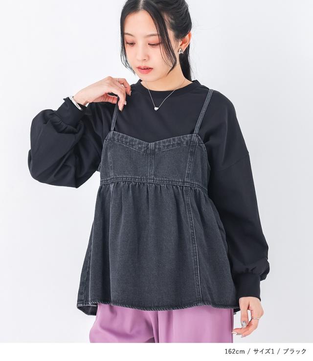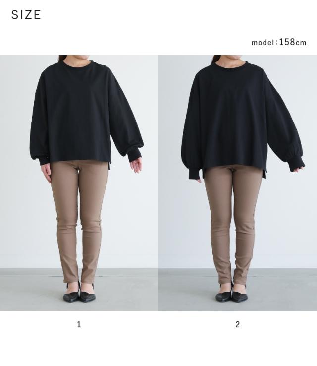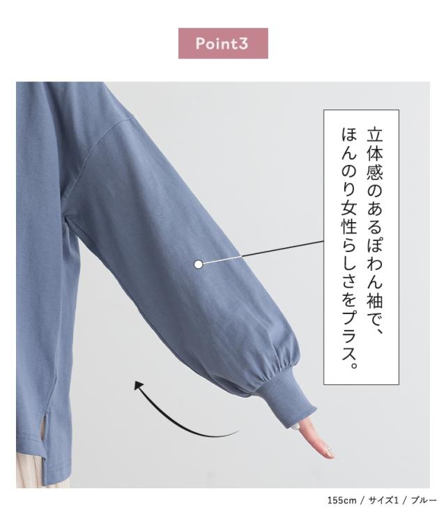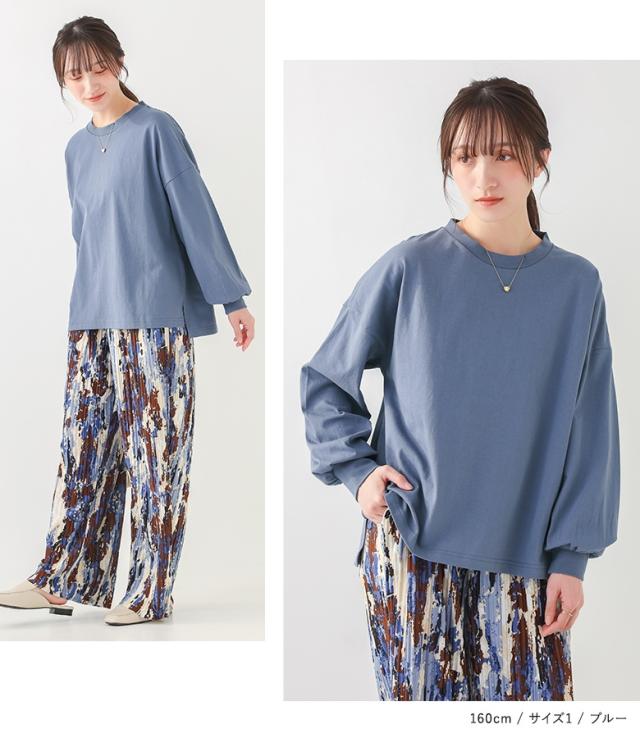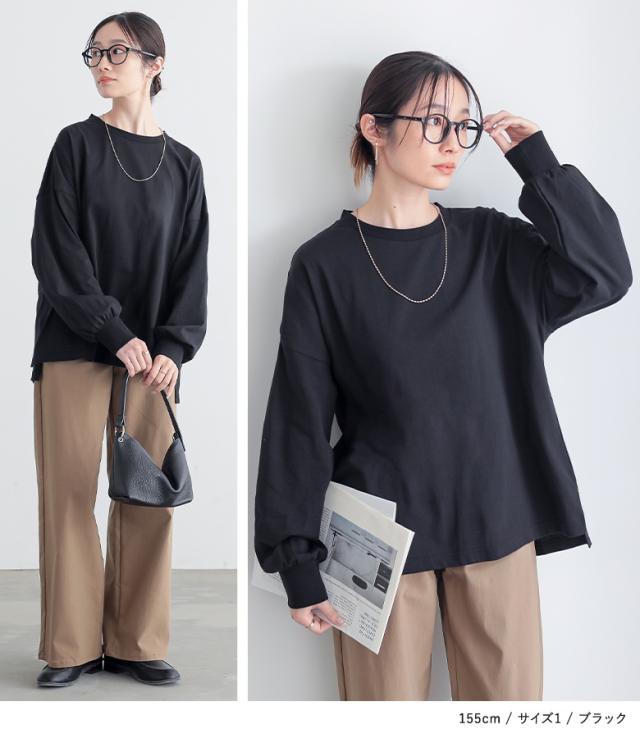 『パフスリーブカットソー』※メール便可※【10】[カットソー レディース トップス ロンT 長袖カットソー コットン100% 綿100% スリット 体型カバー ヒップが隠れる パフスリーブ ]