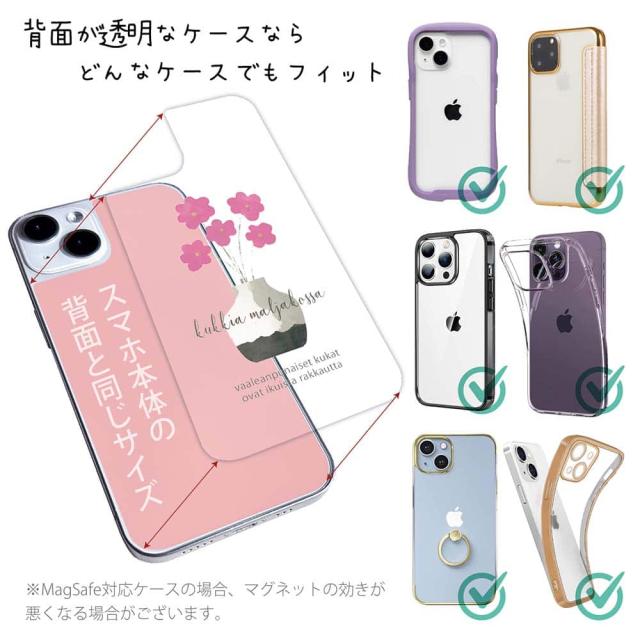 | 注意事項 | ・他の商品とは異なり、お客様都合による交換・返品・キャンセルは一切できない商品となります。ご注文の前に必ず間違いがないかを入念に確認してください。 ・また、シートの取り付け時におけるケースやスマホ本体の破損などは、弊社の責任範囲外となります。 ・UV印刷という方法でシートの印刷をしているため、表面は少しザラついているマット加工になります(商品画像より色が沈んで感じるかも知れません)。 ・背面が曲線になっている機種は対応できません(例えばXperia XZ3など)。 ・お手持ちのスマホケースの背面の状況によって、デザインシートの透け方が変わりますので、予めご了承下さい(曇りガラスのように透けにくい場合はデザインが見えにくくなります)。 ・スマホケースは付属していません(別売)。 ・商品画像の5枚目と6枚目の写真は、スマホの背面の色によるサンプル画像です。シートの背面が透明の場合は、スマホの背面が透けるという意味になりますので、背景の色を変更している訳ではありません。 |