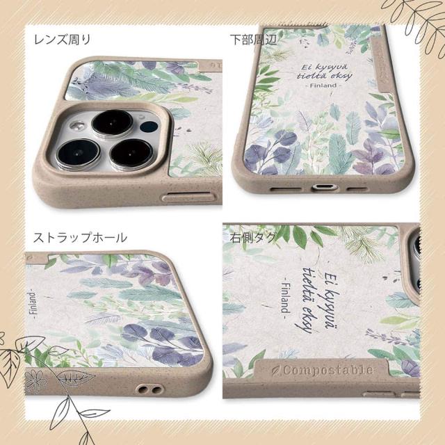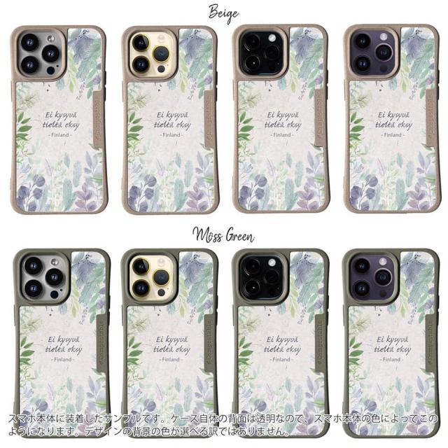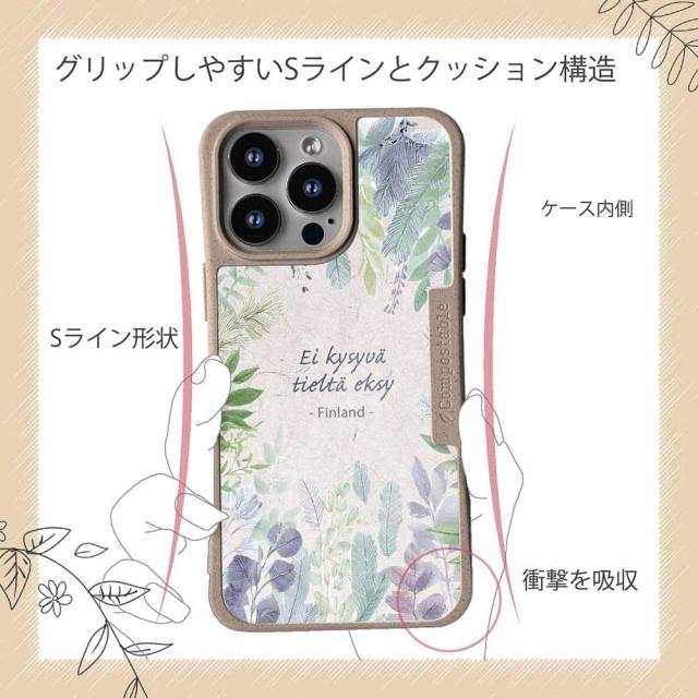 | ケースについて | 背面の内側に入れ込むデザインシートで、シーンに合わせて着せ替え可能。また、グリップしやすいクッション構造で、本体重量は約35gと軽減化を実現。さらに衝撃に強いSライン形状、究極に押しやすいボタン設計(切り込みが入ることで押し込む力を軽減)、背面のカメラ・レンズを保護する高さ設計となっております。生分解性プラスチック素材ながらも着脱もしやすく、割れない・指紋防止加工を施しています。 |
