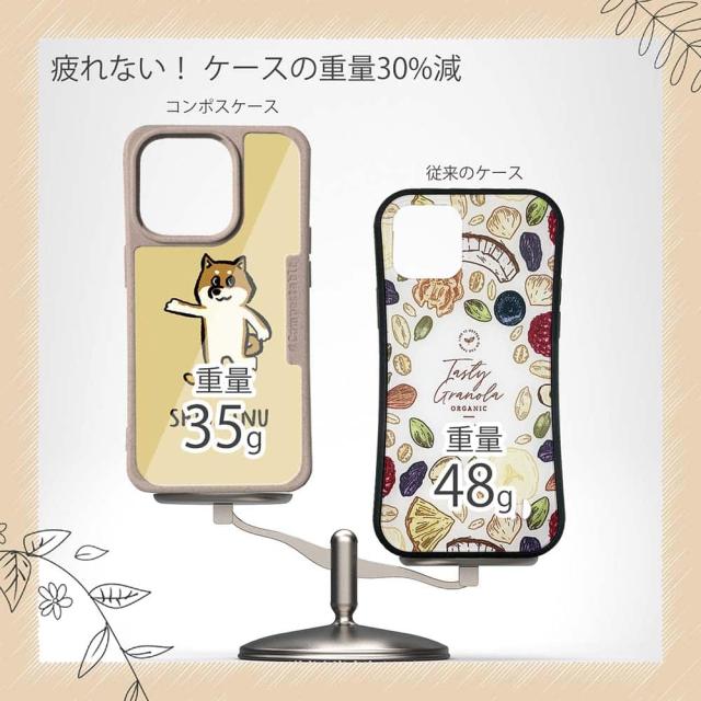 | ケースについて | 背面の内側に入れ込むデザインシートで、シーンに合わせて着せ替え可能。また、グリップしやすいクッション構造で、本体重量は約35gと軽減化を実現。さらに衝撃に強いSライン形状、究極に押しやすいボタン設計(切り込みが入ることで押し込む力を軽減)、背面のカメラ・レンズを保護する高さ設計となっております。生分解性プラスチック素材ながらも着脱もしやすく、割れない・指紋防止加工を施しています。 |