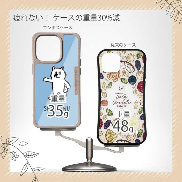 | ケースについて | 背面の内側に入れ込むデザインシートで、シーンに合わせて着せ替え可能。また、グリップしやすいクッション構造で、本体重量は約35gと軽減化を実現。さらに衝撃に強いSライン形状、究極に押しやすいボタン設計(切り込みが入ることで押し込む力を軽減)、背面のカメラ・レンズを保護する高さ設計となっております。生分解性プラスチック素材ながらも着脱もしやすく、割れない・指紋防止加工を施しています。 |