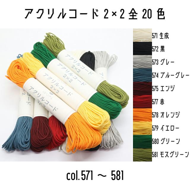 メルヘンアート マクラメ アクリルコード 2×2 約2.5mm×50m巻 571生成/572黒/573グレー/574ブルーグレー/575エンジ/577赤/578オレンジ/579イエロー/580グリーン/581モスグリーン 全20色