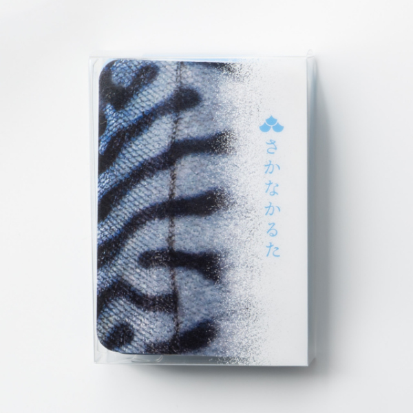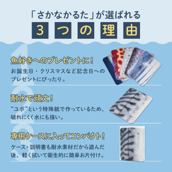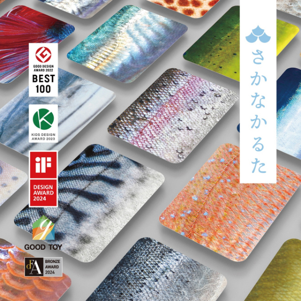 さかなかるたとは、子どもたちに魚の興味や関心事の幅を広げたいという想いから生まれた商品です。魚の表皮(模様や色)のみで、どの魚かを当てるかるたです。日常では見ることのない魚の模様や鮮やかな色彩、魚が光を反射する時のキラキラ感やウロコの凹凸を特殊な印刷技術で再現しています。視力が悪いお年寄りや小さなお子さまなどルール次第で皆で遊べて、魚の漢字や雑学を学ぶこともできます。耐水素材なので、お風呂に浮かべて遊ぶこともできます。