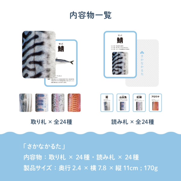 【内容物】■さかなかるた■・取り札 × 24種・読み札 × 24種・説明書 × 1枚■さかなかるた 淡水魚版■・取り札 × 24種・読み札 × 24種・説明書 × 1枚【商品情報】■サイズ:74mm×105mm(かるた本体)■使用材質:YUPO■対象年齢:7歳以上