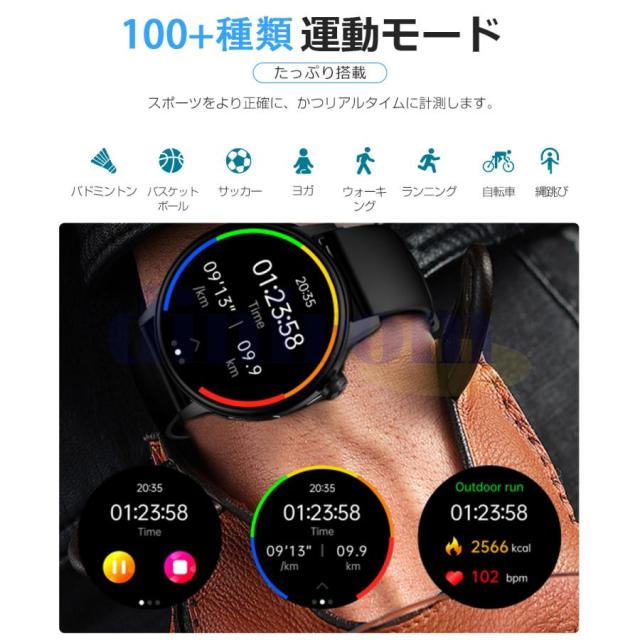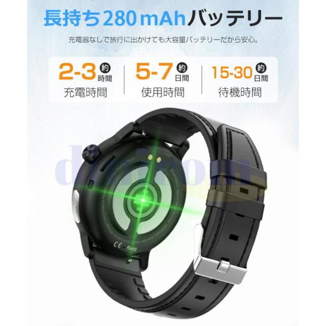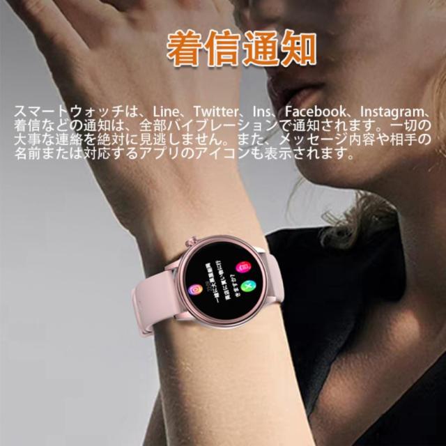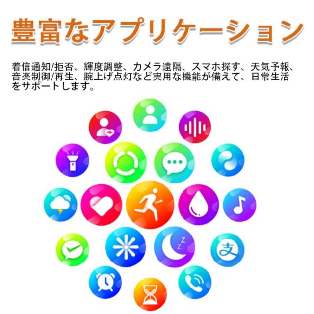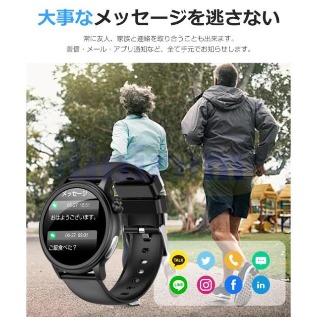 【長持ちバッテリー&便利な通知機能】- スマートウォッチは消費電力の方から最適化されています。280mAhの大容量バッテリーはフル充電(2時間)後、7日間の使用時間と30日間の待機時間を持ちできます。(個人の利用状況によって、使用時間が少し違います)。 スマートウォッチをスマホに接続した後、着信をリマインダー、重要なSMSメッセージを受信して読めますように振動します。満員電車の中、運動中や打ち合わせ中などスマホを取り出せない状況でも、大切なメッセージや着信を見逃しません。(Line、Twitter、Facebook(Meta)、Instagramなどをサポートします。)お休みモードも設定でき、寝る前に「振動」「メッセージ通知」をオフすることができます。(ご注意:電話をかけるや返信などの機能がいただけません)