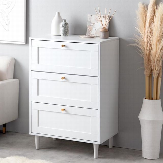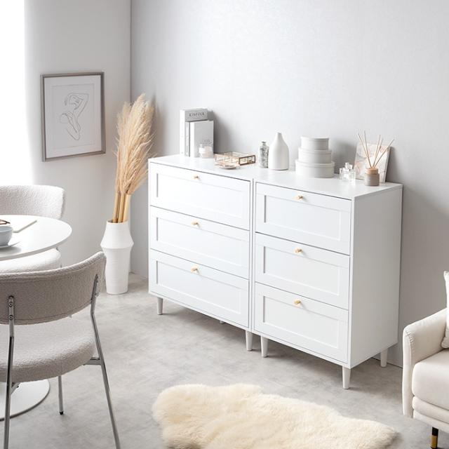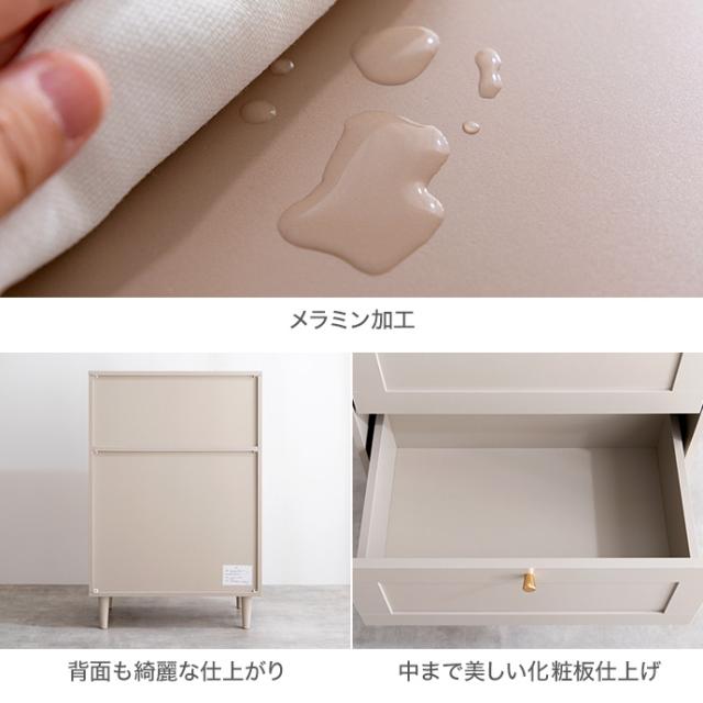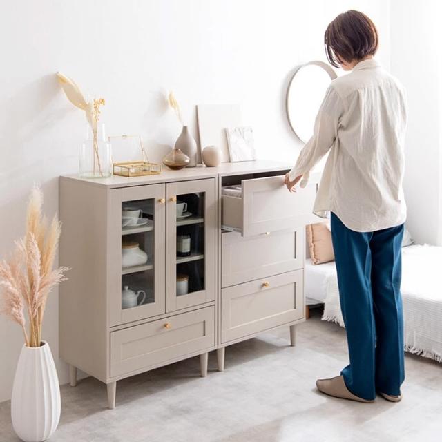 品のある框(かまち)デザインと柔らかなニュアンスカラーが印象的なチェスト。
