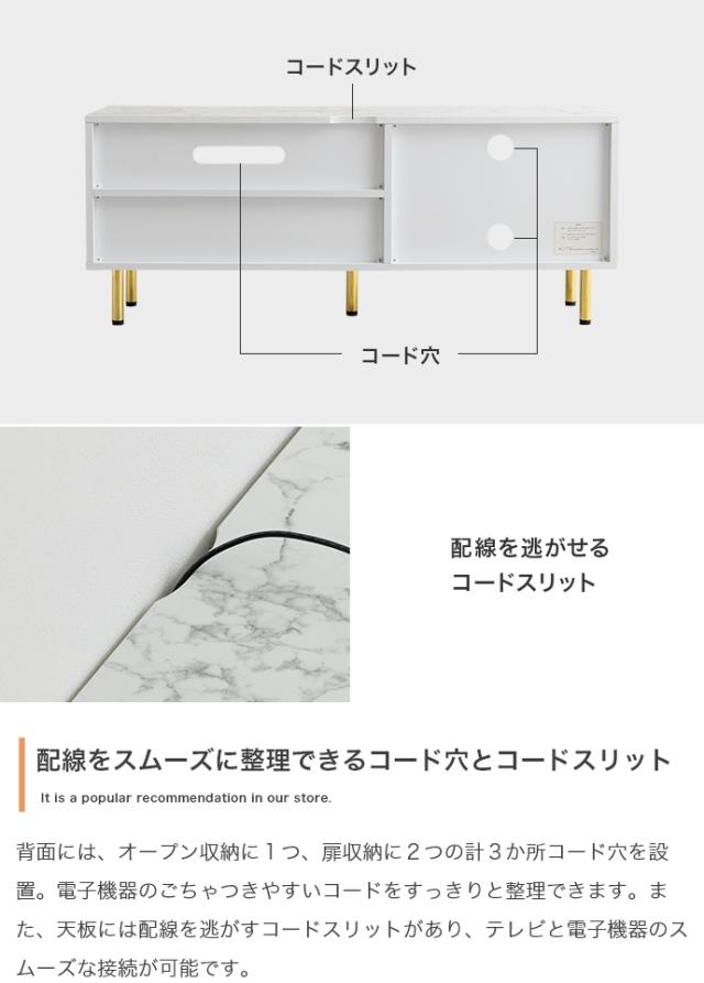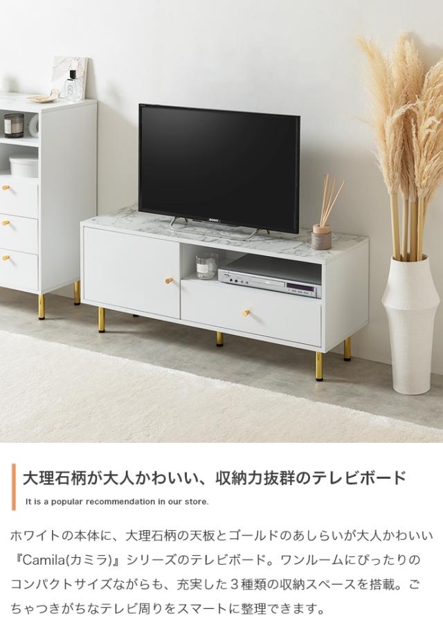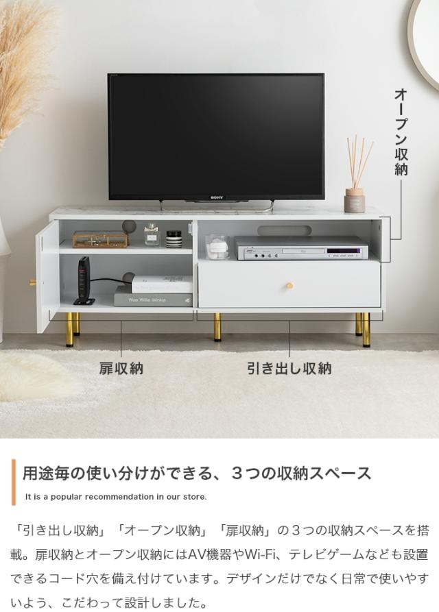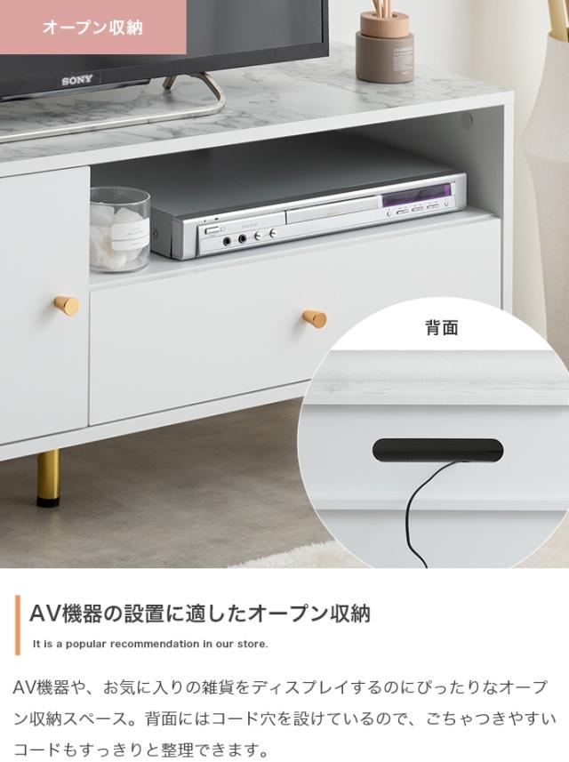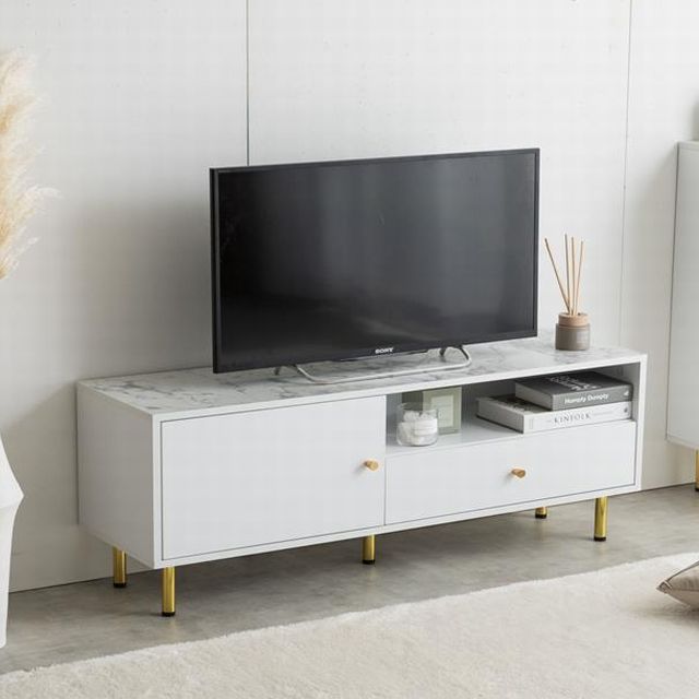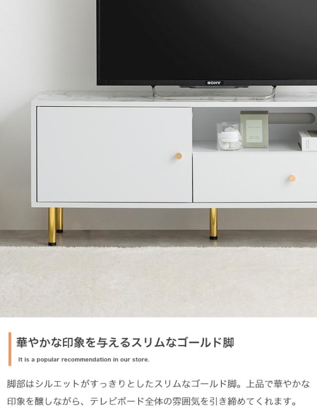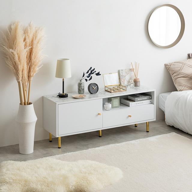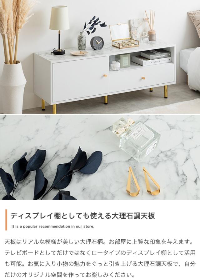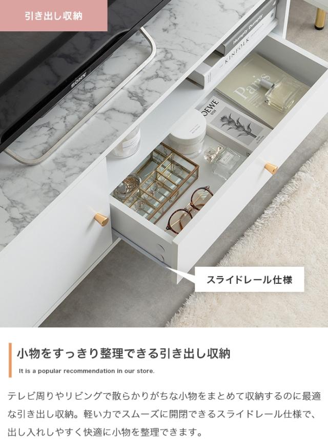 天板の大理石柄とゴールドのあしらいが特徴の引き出し付きテレビボード。