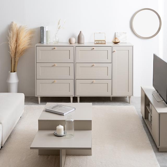 品のある框(かまち)デザインと柔らかなニュアンスカラーが印象的なキャビネット。